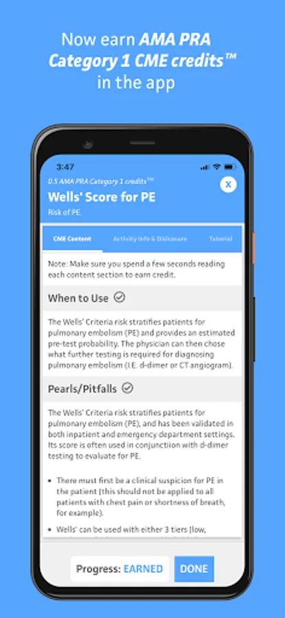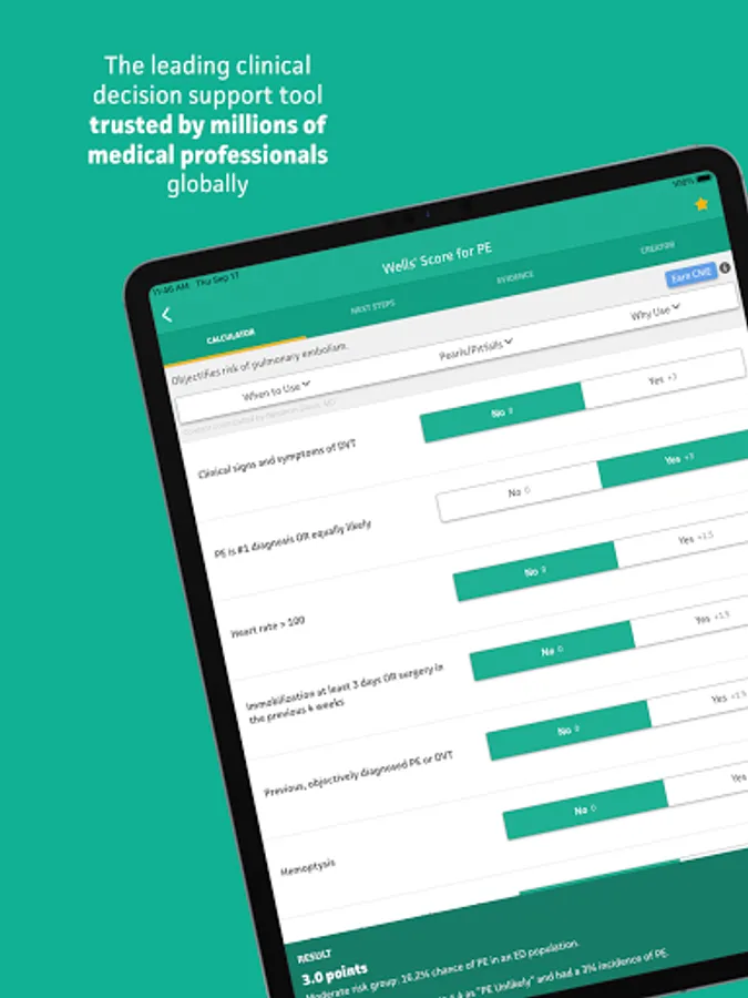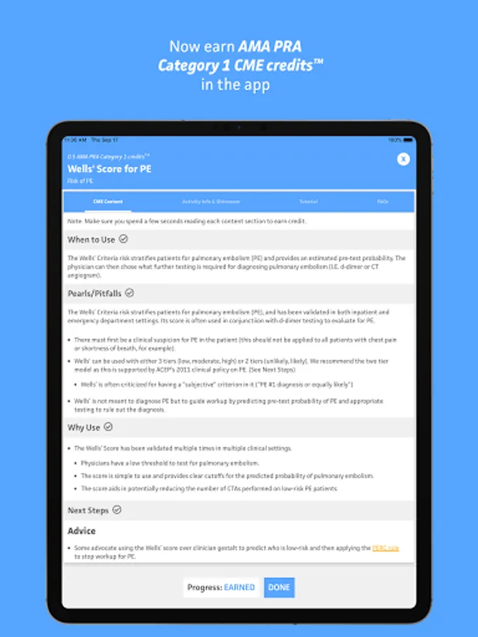With a new enhancement, clinicians can now earn AMA PRA Category 1TM CME credits by simply reading the clinical content for 150+ calculators. The app will keep track of the CME credits earned in a personal dashboard, where users can also redeem credits for certificates and access their receipts for easy documentation. In order to redeem CME credits, users will need to sign up for a paid CME plan.
