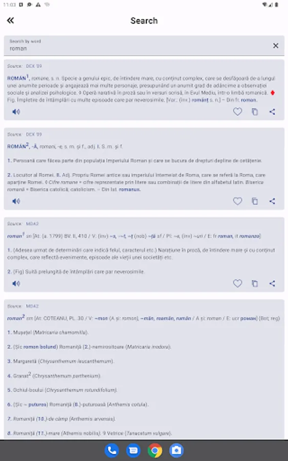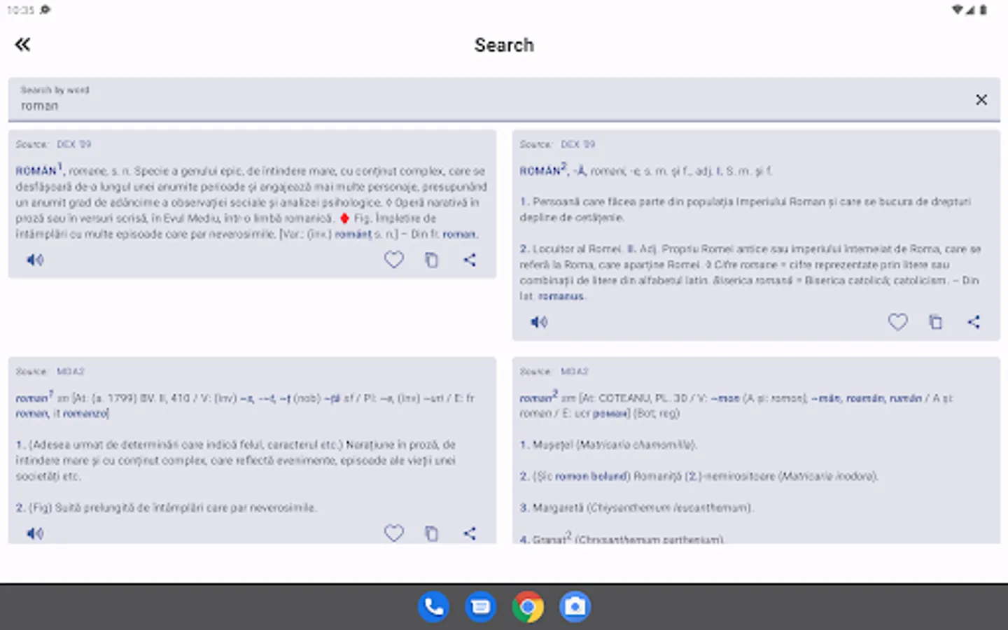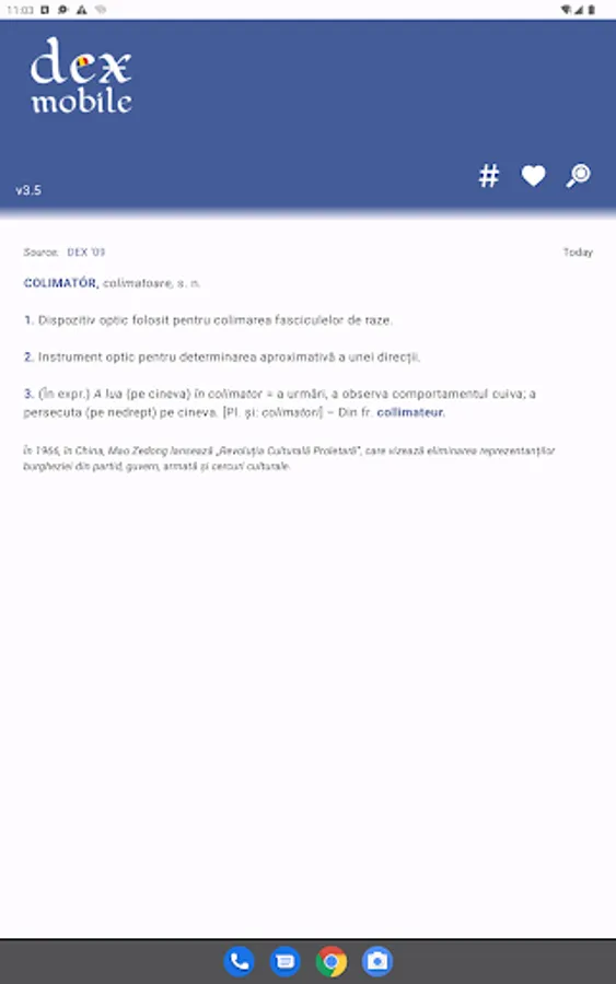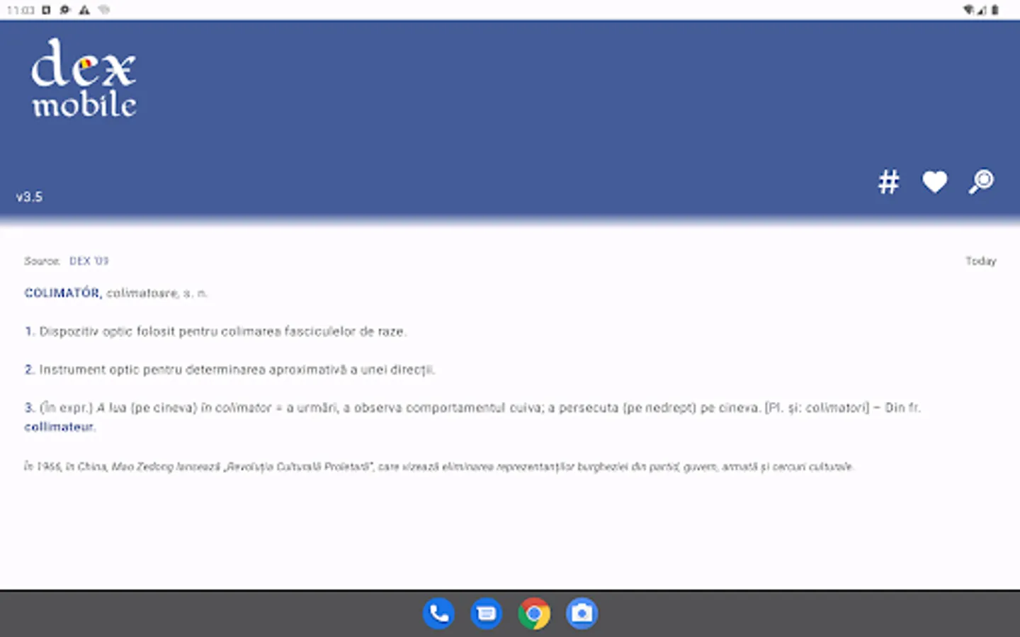 dexmobile (dex mobile) - the application allows you to search for definitions of a certain word in Romanian. It also includes the list of words of the day on dexonline.ro. Allows definition sharing and marking. It works even without an active internet connection using offline mode.
