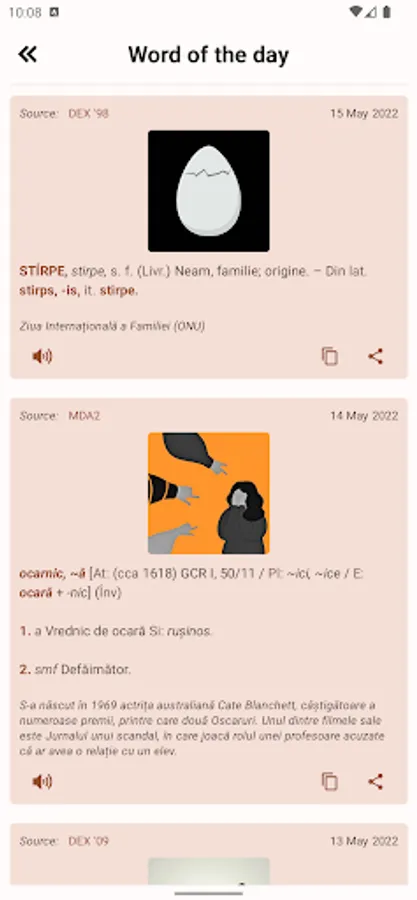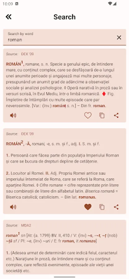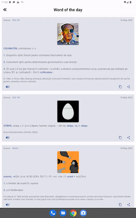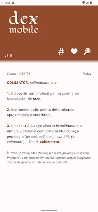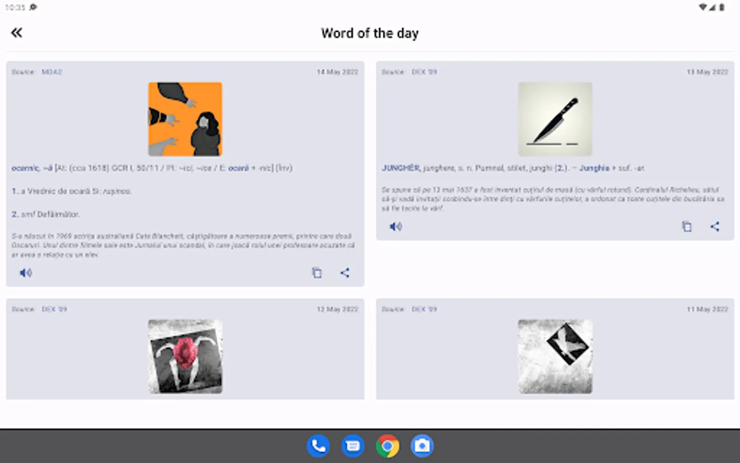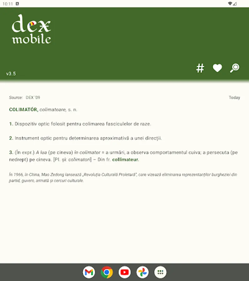 dexmobile (dex mobile) - the application allows you to search for definitions of a certain word in Romanian. It also includes the list of words of the day on dexonline.ro. Allows definition sharing and marking. It works even without an active internet connection using offline mode.