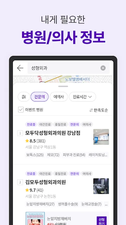 Hospitals nationwide including dentistry, dermatology, obstetrics and gynecology, urology, orthopedic surgery, mental health medicine, surgery, plastic surgery, anesthesia and pain medicine, neurosurgery, rehabilitation medicine, neurology, ophthalmology, oriental medicine, internal medicine, otolaryngology, pediatrics, family medicine, etc. Read live visitor reviews