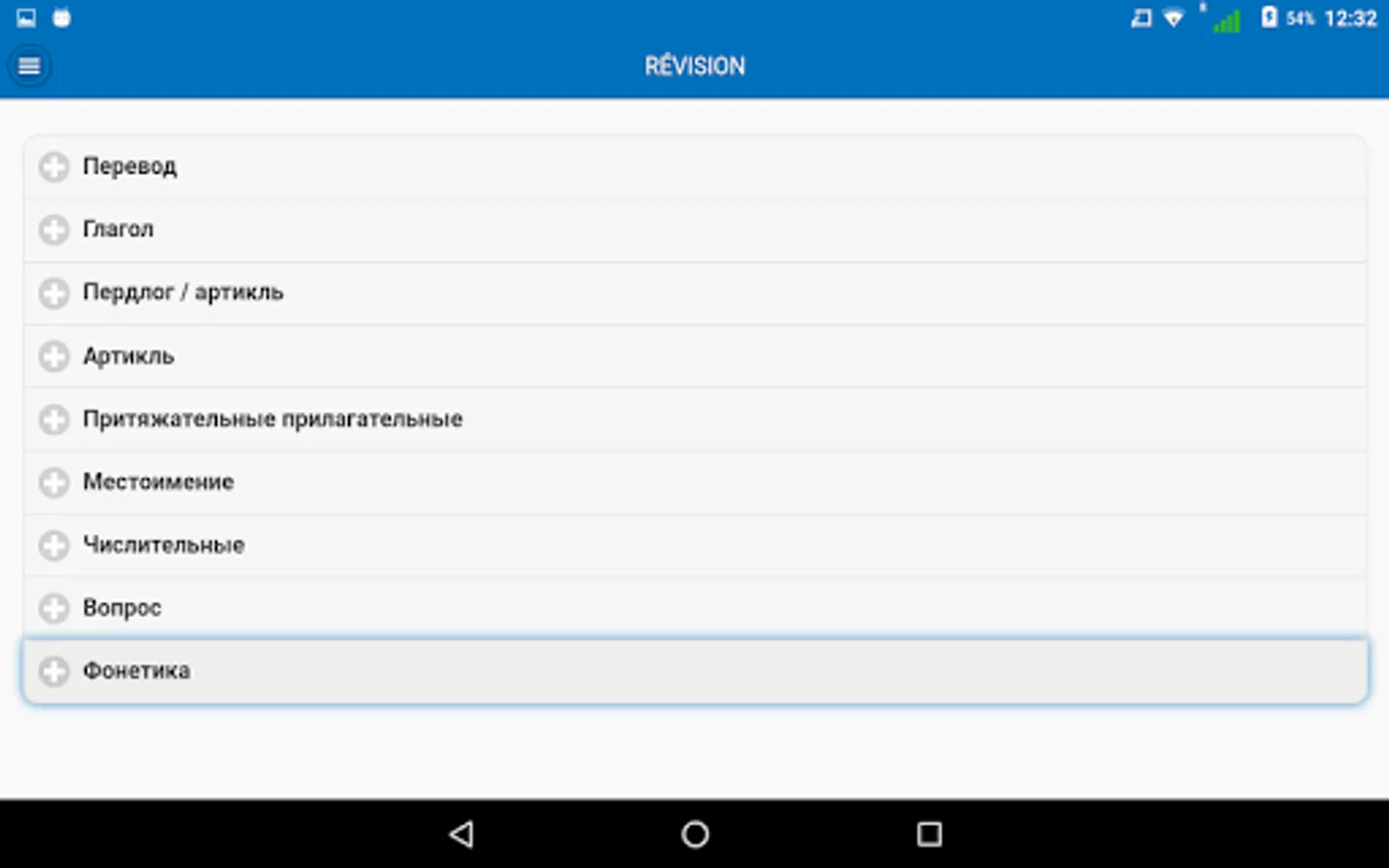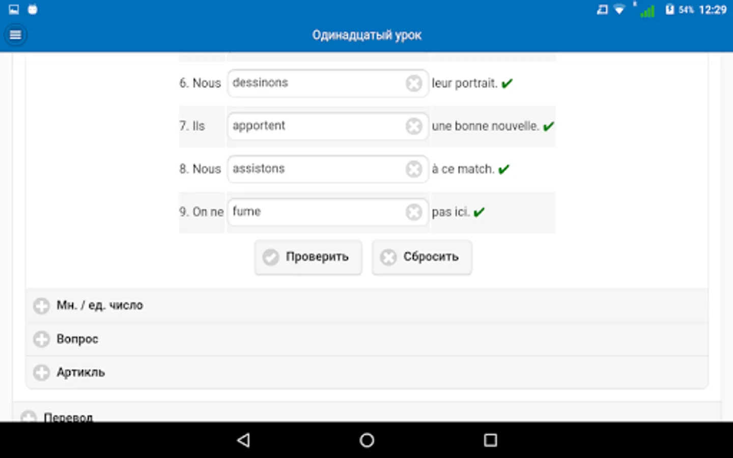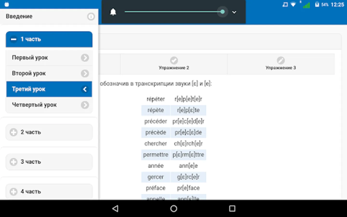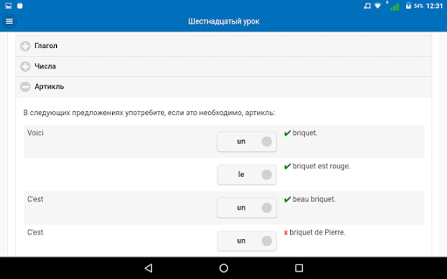 The application includes exercises from sixteen lessons of the introductory part of the textbook and the final group of exercises to test residual knowledge.