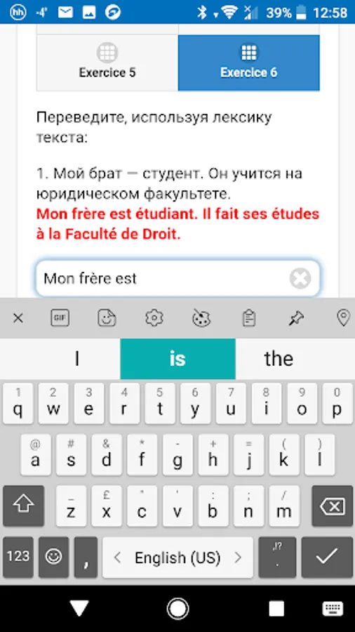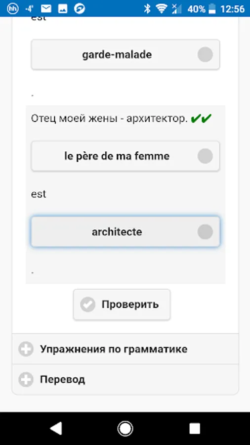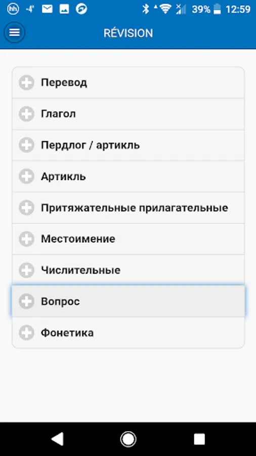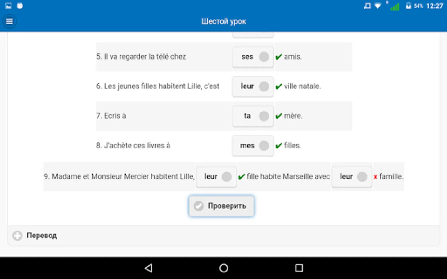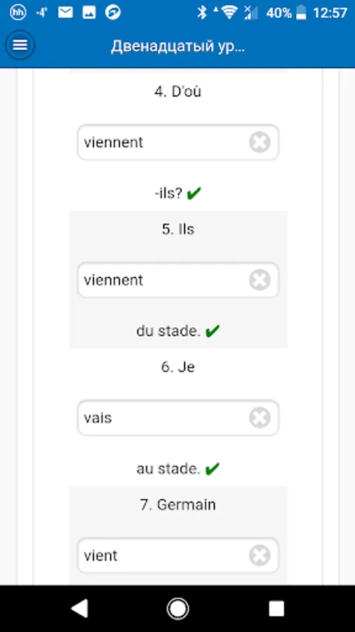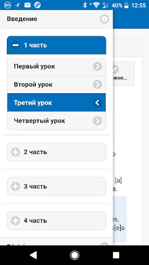 The application includes exercises from sixteen lessons of the introductory part of the textbook and the final group of exercises to test residual knowledge.