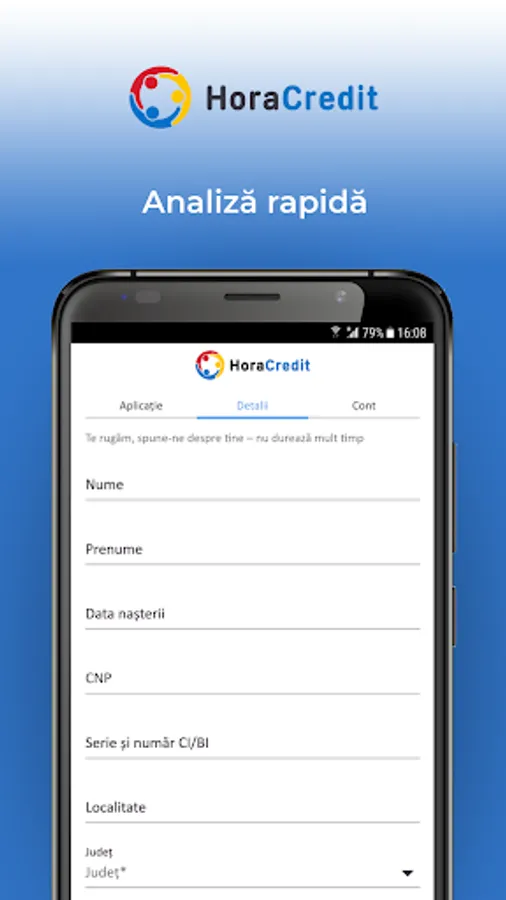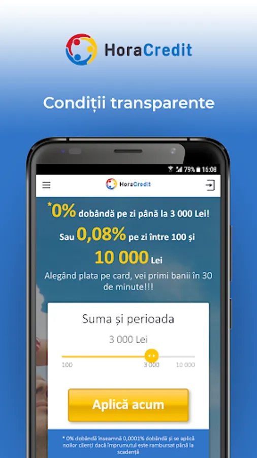 Applying for a Hora Credit loan is quick and easy. To get a loan of up to 10,000 RON, you only need an internet connection and the online transmission, in your personal account, of your identity card and bank account statement. You will receive the decision to credit the requested amount in a few minutes.
