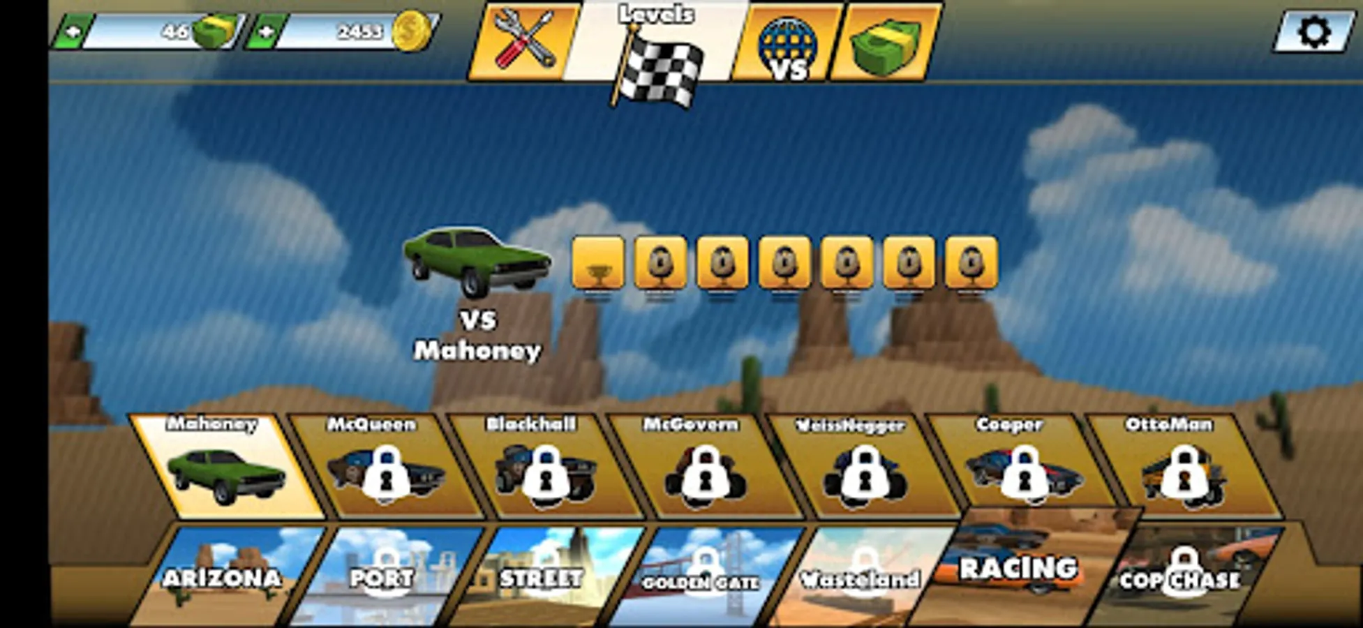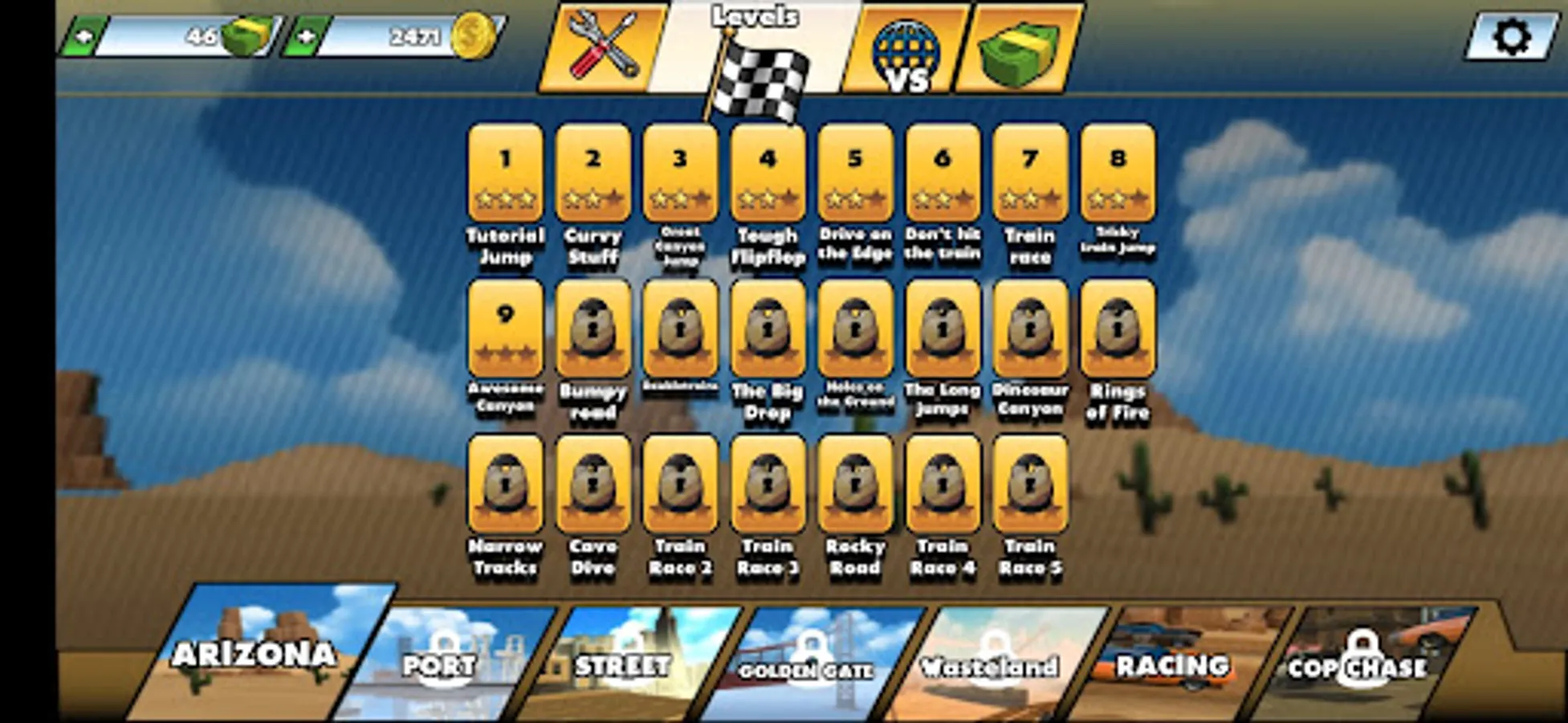 Different venues! You will travel every inch of America while jumping off the ramps with your car! Stand ramps set up in the most famous places of America are waiting for you! Golden gate, streets of America, Port, Arizona and many more venues!