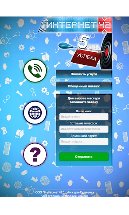 An application for the convenience of using the services of an Internet provider Internet42. Call the wizard, quick access to your personal account and website, payment for services and the promised payment. Internet 42 - Internet connection at home, in the country and in the office. Anzhero-Sudzhensk, st. Gagarin 2a, t. 8 904 966 66 42.