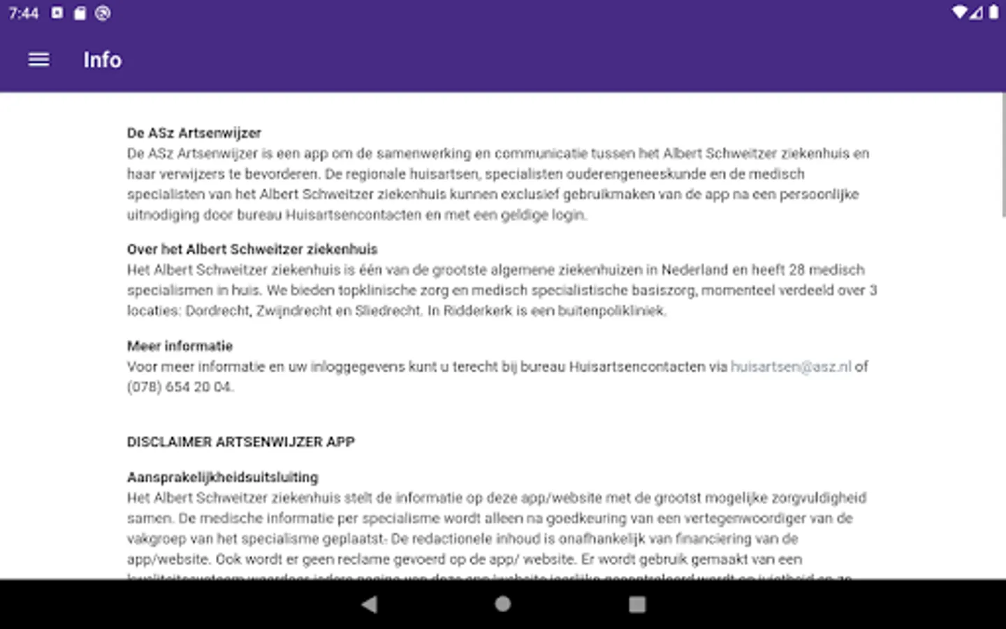 The regional general practitioners, specialists in geriatric medicine and medical specialists at the Albert Schweitzer Hospital exclusive use of the ASA Artsenwijzer App. Desk Doctor contacts provided at your request in a personal invitation to an associated login and password.