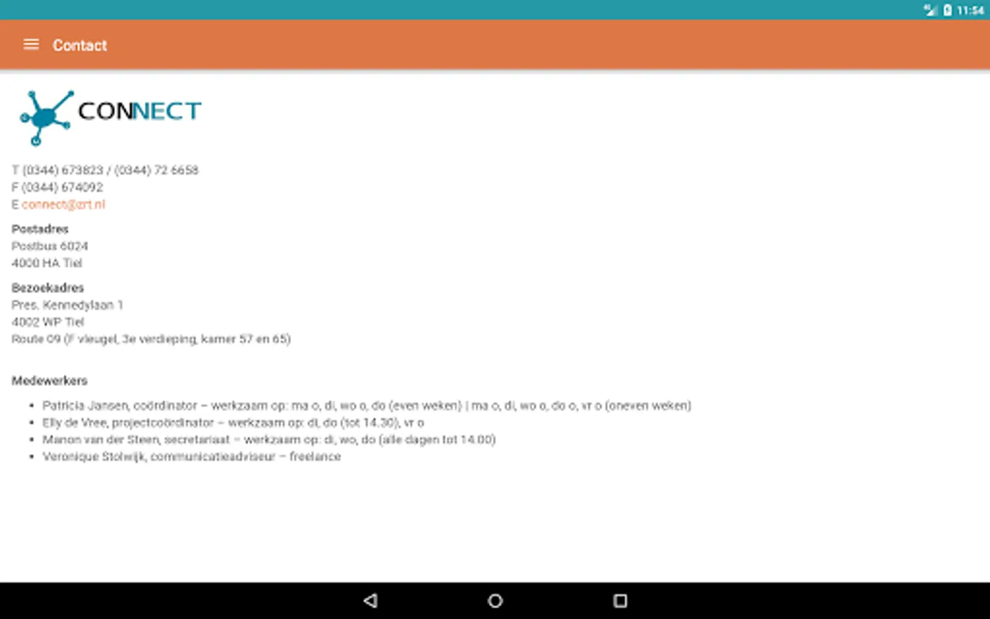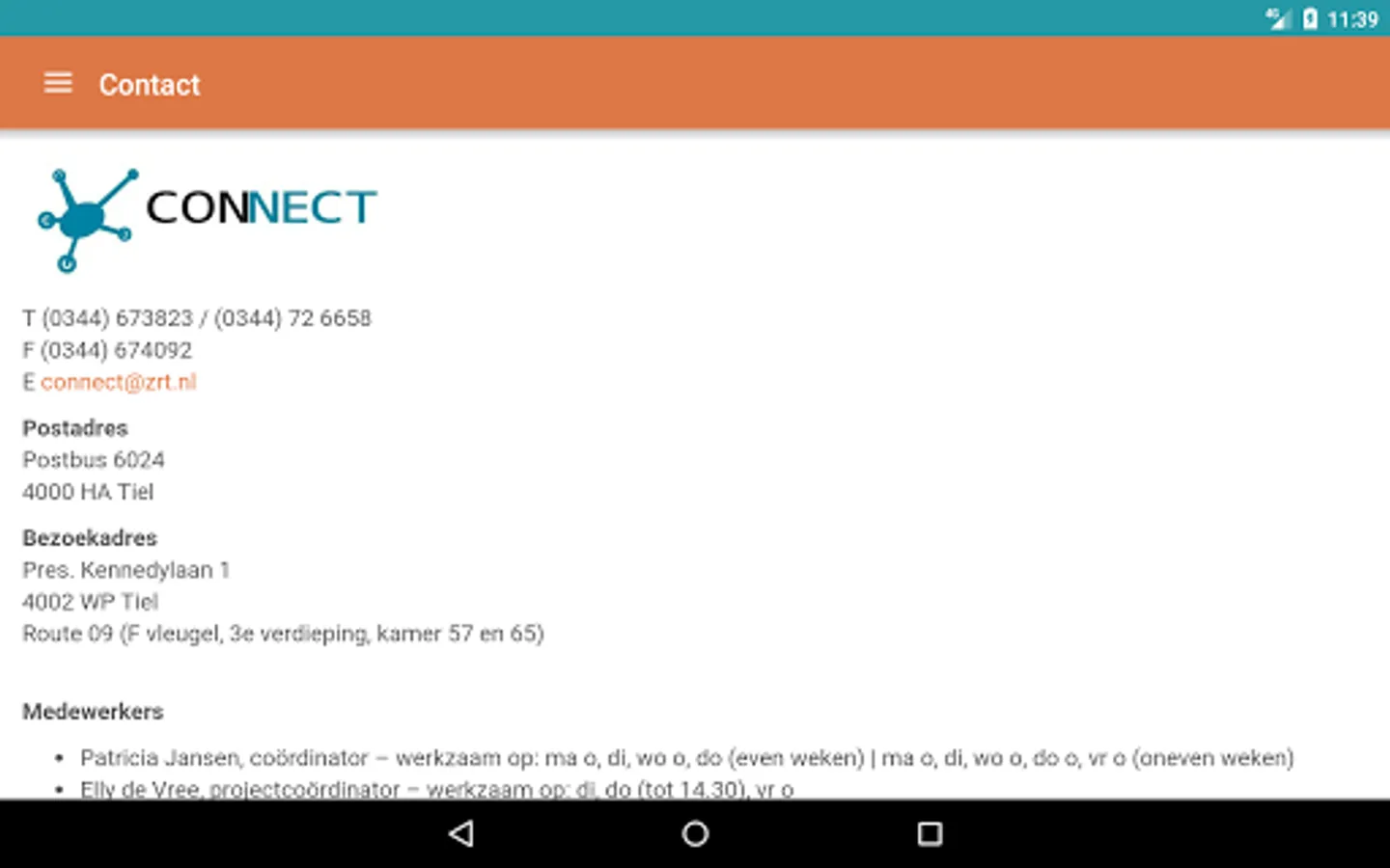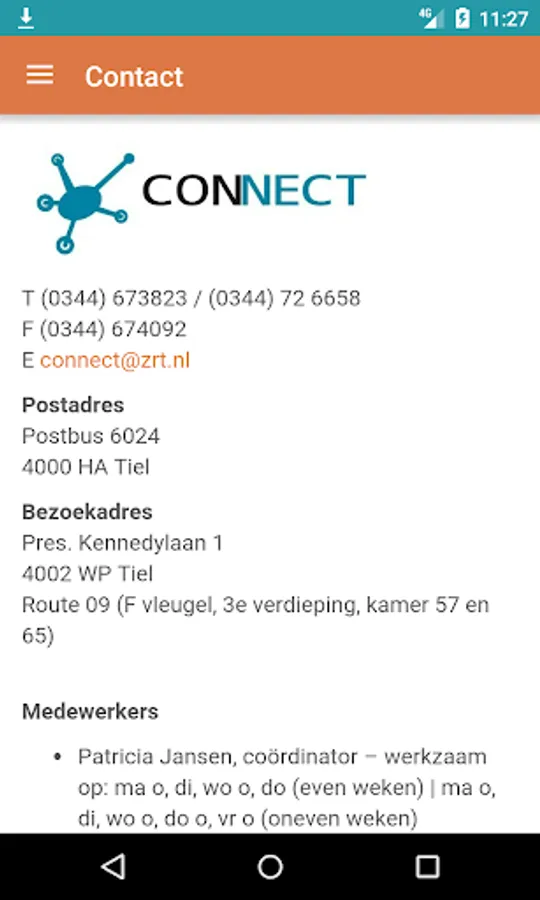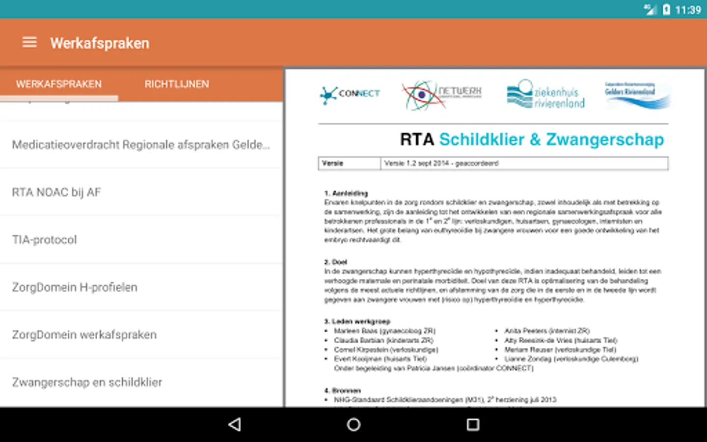 The CONNECT app includes a face book (who's who) containing contact GPs, medical specialists, pharmacists and specialists in geriatric medicine in the Riverland region. Also, all the working arrangements (Regional Transmural Agreements) of CONNECT to be found in the application, which are prepared by general practitioners and medical specialists together. There work arrangements can be searched by category, alphabetically, and by a general search. The app includes CONNECT recent newsletters. For the facebook users need a login and access the Internet. The working arrangements and newsletters are visible to everyone and offline. The content of the app is updated regularly.