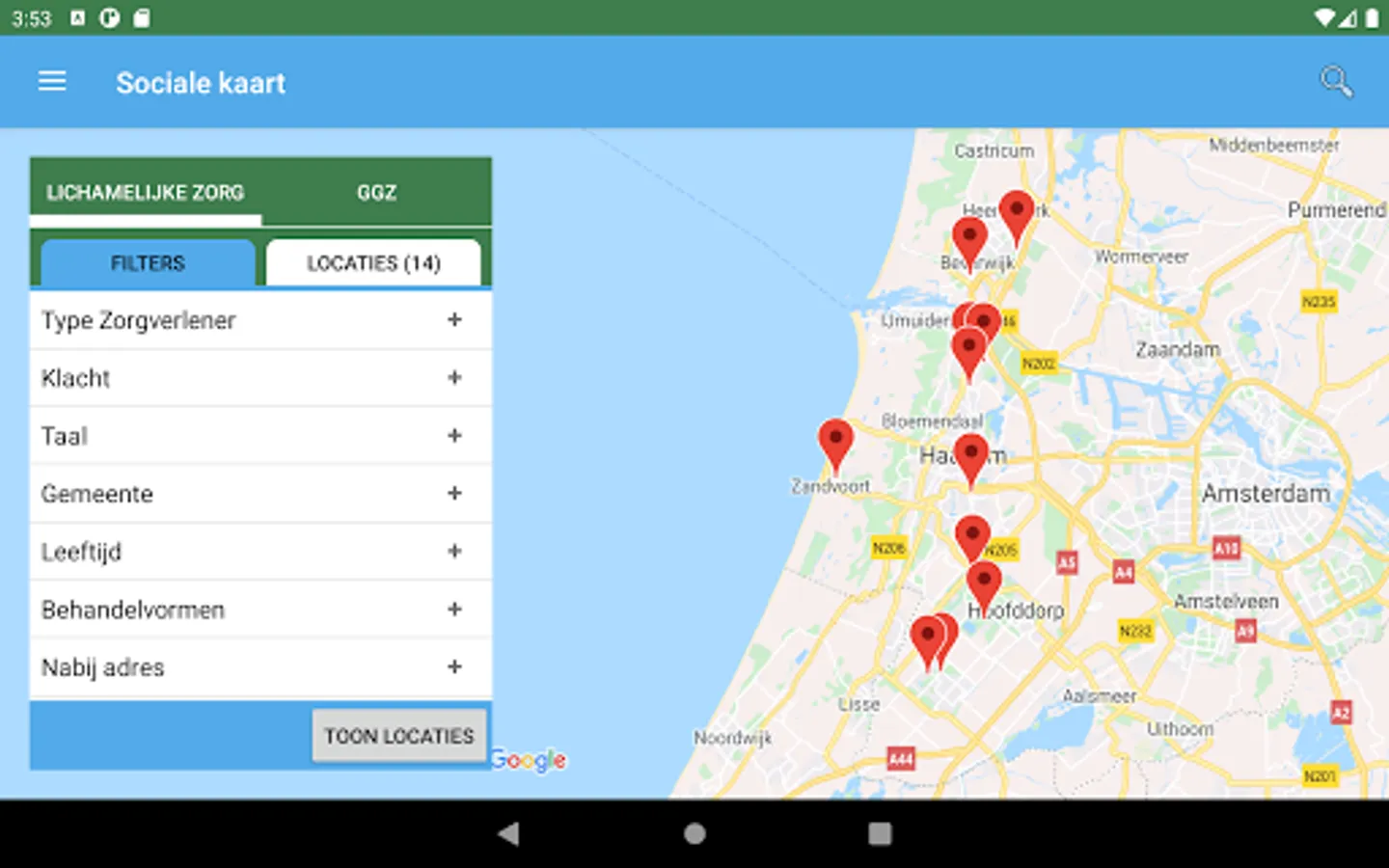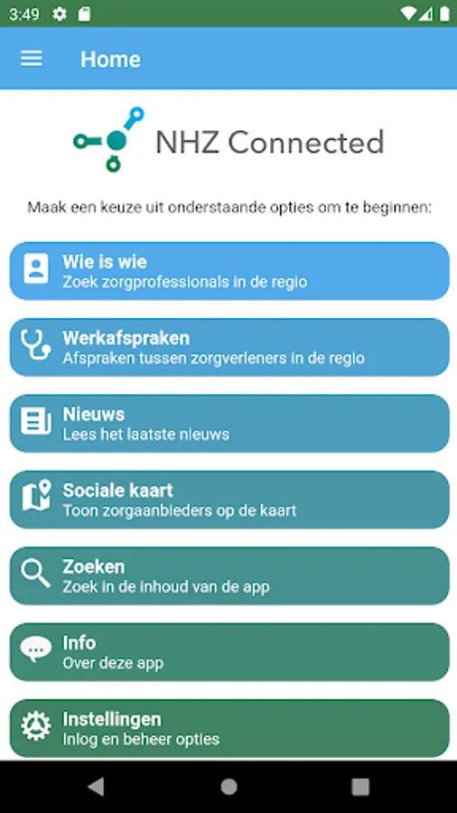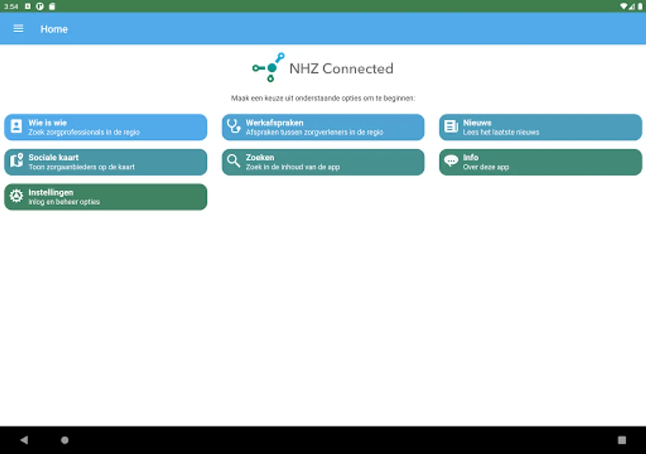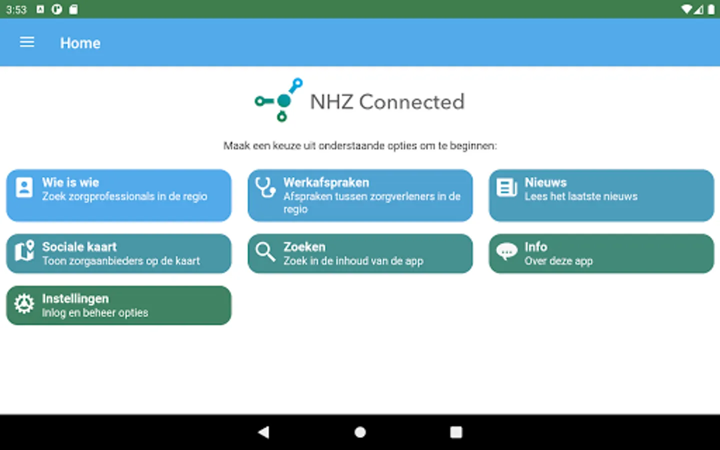 The North Holland South (NHZ) Connected app originated from an initiative of the Medical Coordinating Center (MCC) Haarlem en Meer. The idea of the app is that care providers in the region (1st and 2nd line) can find and reach each other more easily in order to promote mutual cooperation. The app and accompanying website (www.nhz-connected.nl) are the regional information platform for this.