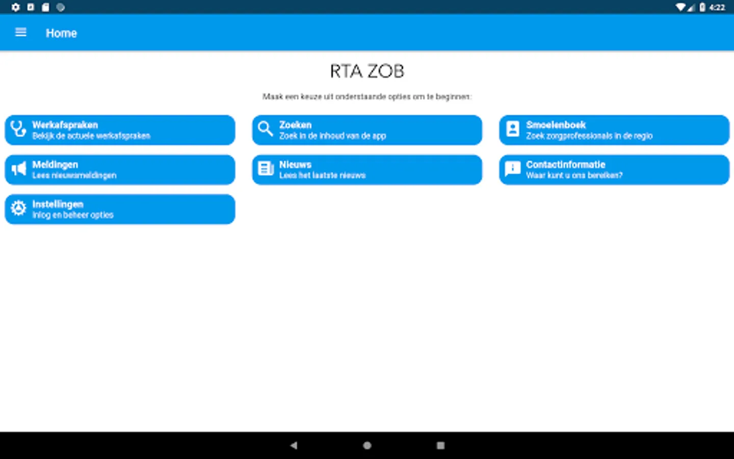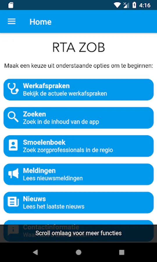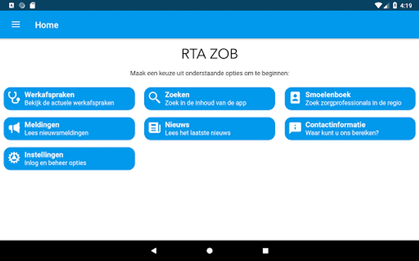 The RTA ZOB app contains all regional transmural agreements that apply to the Southeast Brabant region. The transmural centers HaCa, THEMA and TransMáx aim to promote cooperation in healthcare, and jointly designed the RTA ZOB app to contribute to this.