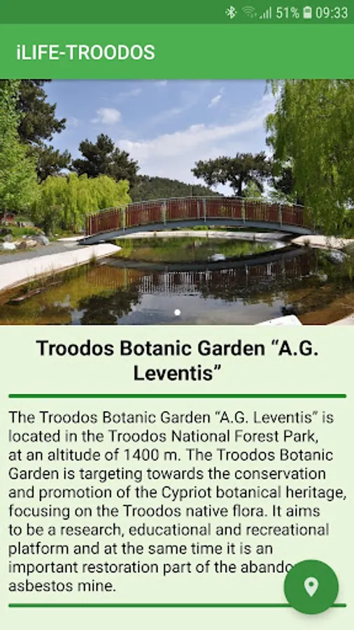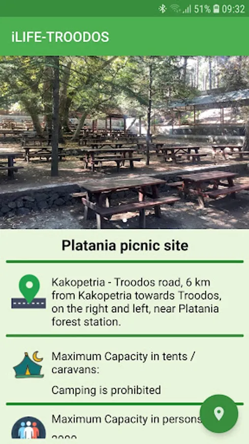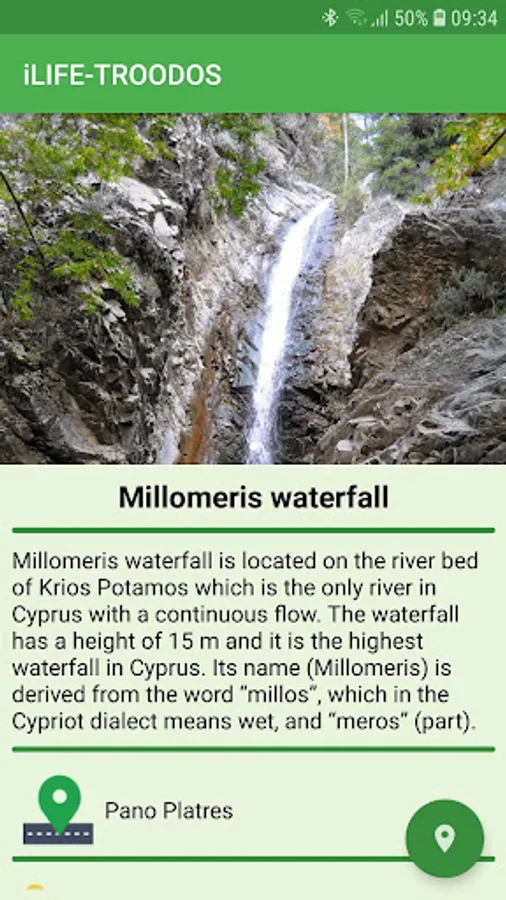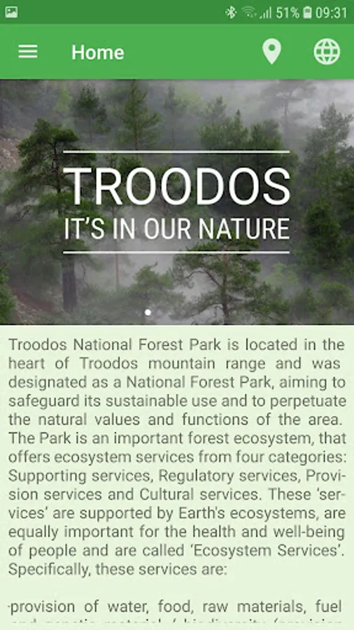 Ecosystem Services’ (LIFE16 GIE/CY/000709), which is co-funded by the LIFE program of the European Union. The App aims to provide information to the visitors of the Troodos National Forest Park about the natural values of the Park and the ecosystem services it provides. It seeks to become the ultimate tool for the visitors, providing information regarding the biodiversity of the area and the available opportunities for recreation, like: