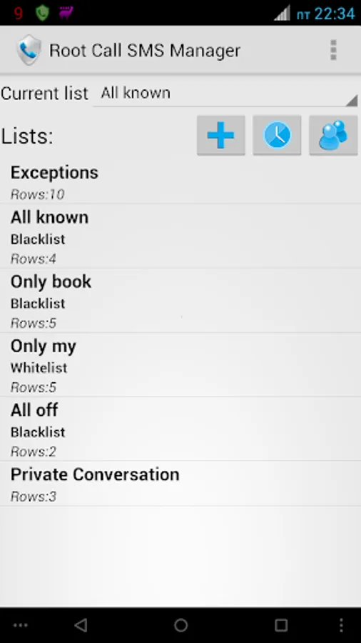 Integration with Tasker: for use of Tasker it is necessary to add "To start the application" as a task, to choose Root Call Manager and to enter a list name into the data field. Thus there will be a chosen list will be made the current.