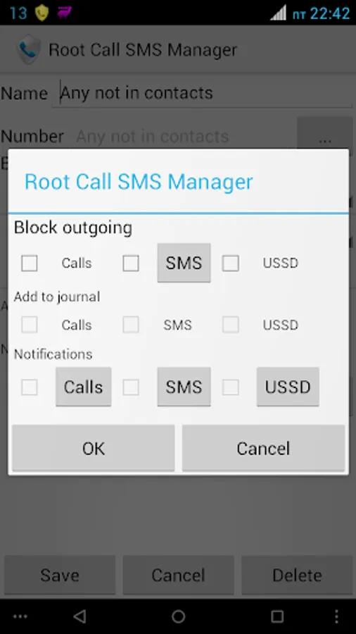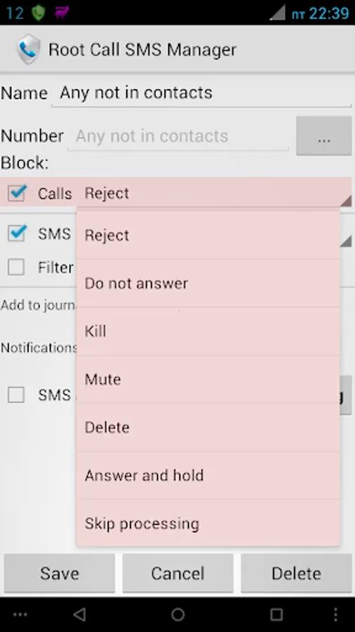For calls it is possible to choose a way of blocking "Reject" or "Not to answer". For SMS at desire it is possible to set the filter in the text (if the filter isn't set, all SMS from specified number are blocked). For division of several filters the symbol is used ";". If at the beginning of a field for the filter to put a symbol "!" all SMS not corresponding to the filter will be blocked.