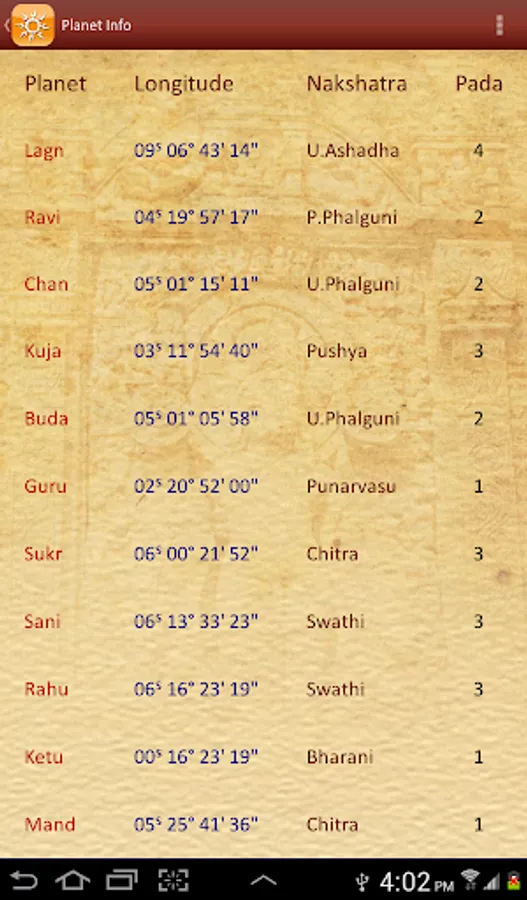 - Sidereal planetary longitudes along with nakshatra and pada with retrograde info.
