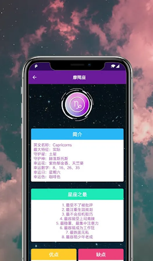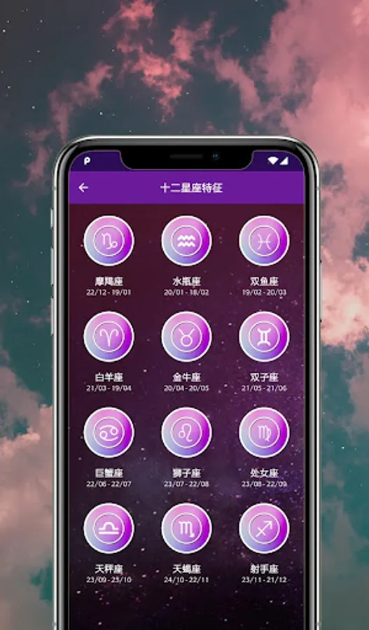 Twelve constellations: Capricorn, Aquarius, Pisces, Aries, Taurus, Gemini, Cancer, Leo, Virgo, Libra, Scorpio and Sagittarius. It illustrates a person's innate personality and also symbolizes the psychological level, reflecting a person's behavioral expression.