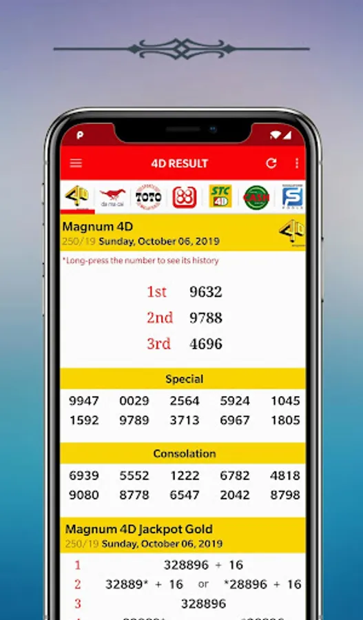 This LIVE 4D Results application DO NOT provide any service to facilitate or even promoting online gambling. This application is simply an application where you can check the latest draw results for the registered and licensed lottery draws available in Malaysia and Singapore.