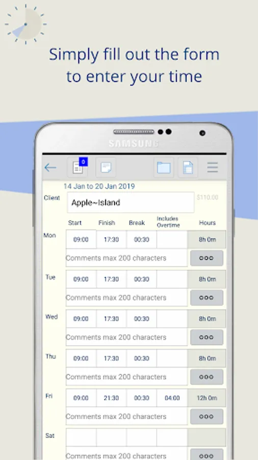 •Quick time entry - simply tap hours to pre-fill times with your defaults.
