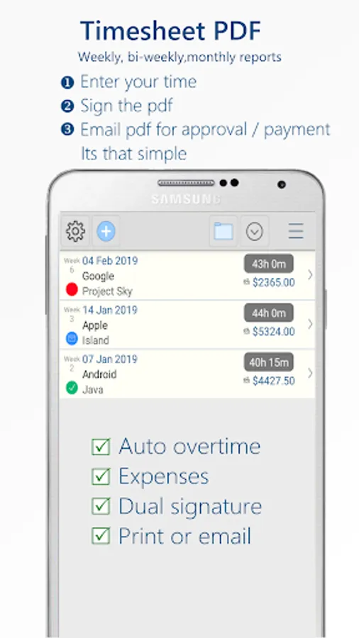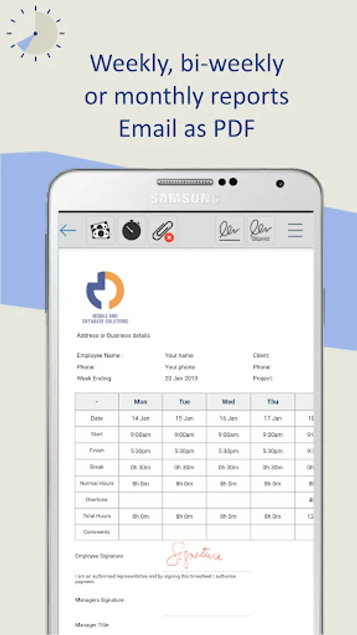 •Sign and send timesheet as PDF email attachment or upload to google drive.