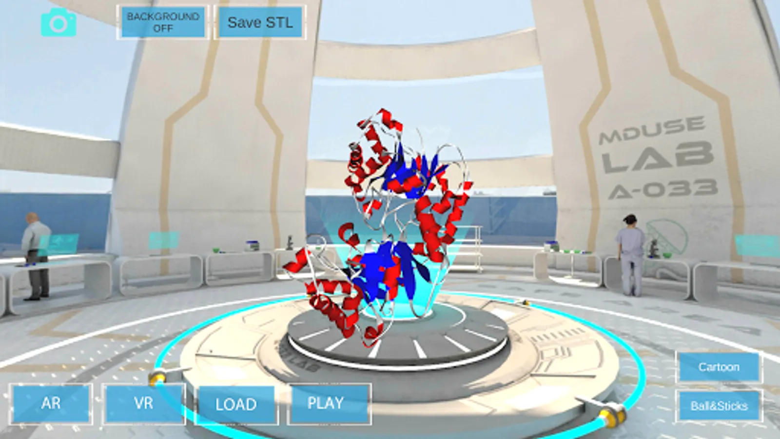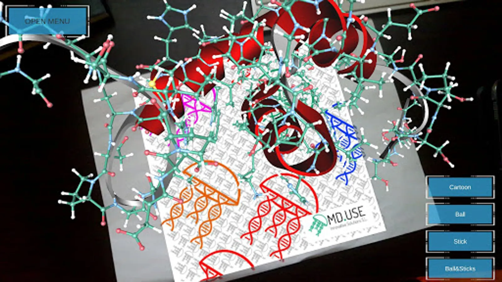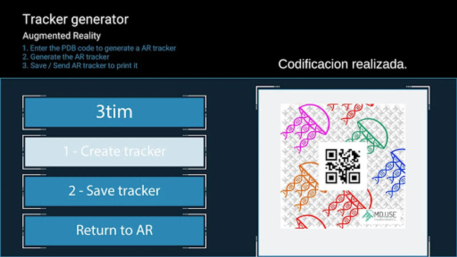 structure of molecules in 3D, VR, and AR. The software incorporates a unique AR tracker creator for any molecule, which allows the autonomous building of AR patterns by the user. Additionally, it has an option to export STL files for 3D printers or edition in 3D software. It recognizes any molecule in PDB format, but it is especially