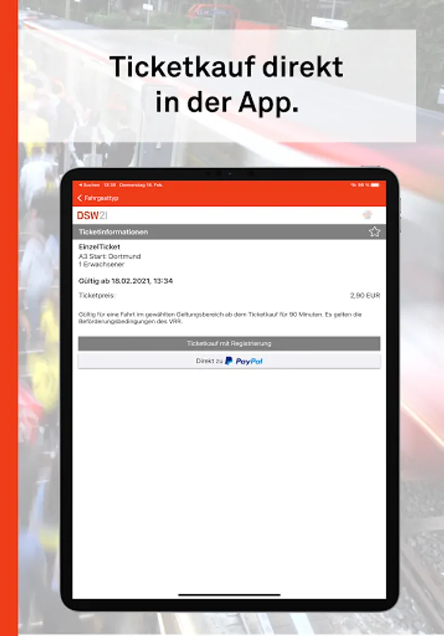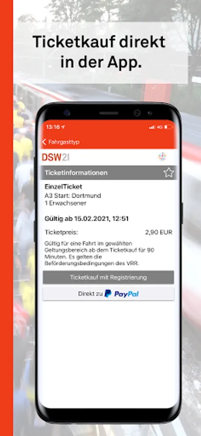 With the DSW21 app you can buy your online ticket for bus and train directly. Register once and you can buy tickets with a simple click. Choose how you want to pay: by credit card, PayPal, direct debit or prepaid.