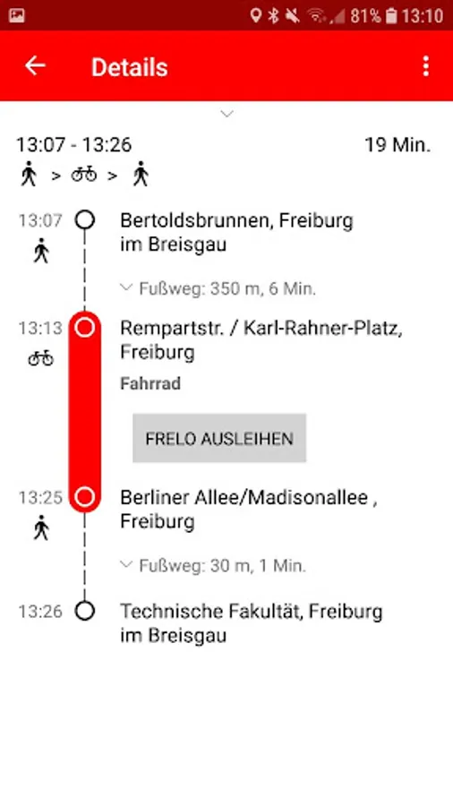 Real-time information is available for many trains, buses and light rail vehicles as well as for our bike rental system Frelo. So you can check on the way, whether your journey starts on time, currently a rental bike of the desired station is available or you can spontaneously opt for an alternative connection. For connections with the Freiburger Verkehrs AG it will be indicated if the vehicle is barrier-free.