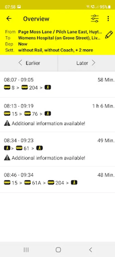 The Merseytravel journey planner app provides timetable, real time information (where available) and map information for all public transport providers across Merseyside. It provides door to door journey plans for trains, buses, and ferry services as well as scheduled departures from a specific location. The app allows you to plan journeys for now and any time in the future.
