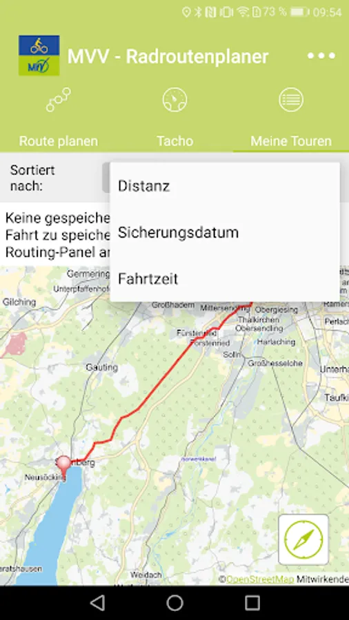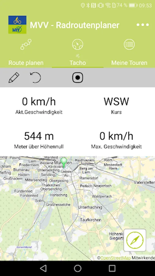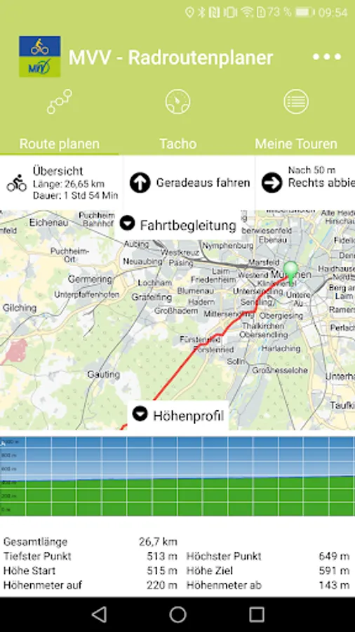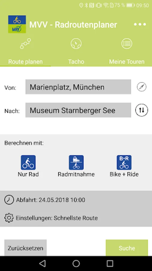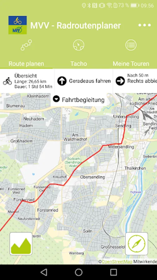 In MVV Radroutenplaner making various drive settings: You can adjust the average speed, prefer special trail character for your individual needs (mountain bike, road bike, ...) or avoid inclines. The integrated drive monitoring warns in combination with GPS on request, if you leave the calculated route.