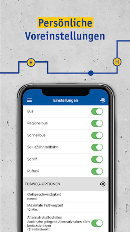 You can query your desired connection by entering your starting and destination points and the departure time. The starting and finishing point can be a place, a street or a stop. All the available connections are then displayed in our app - including a map section for better orientation.