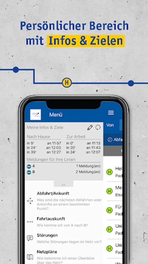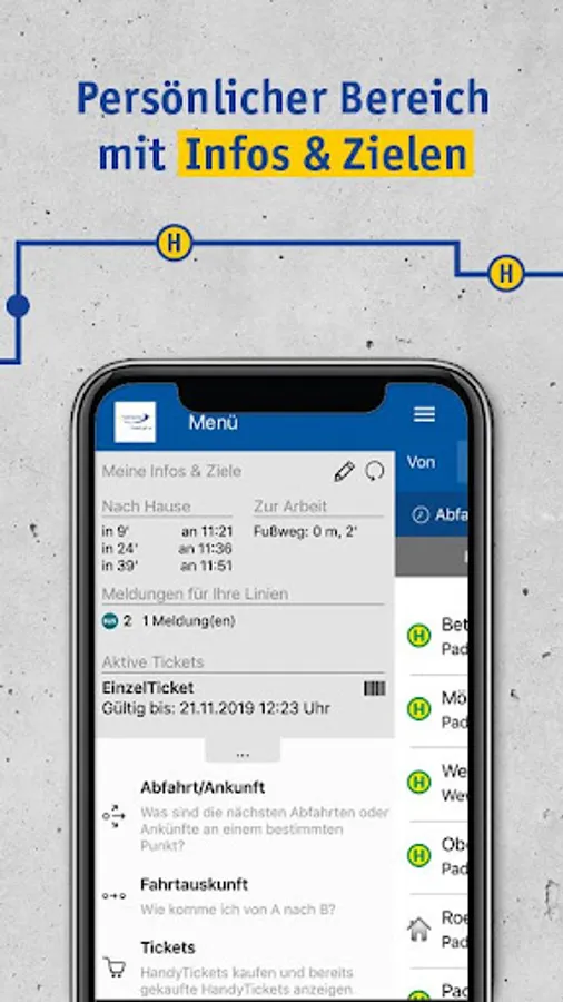 The personal area ensures that you always have an eye on the bus connections that you use most frequently: dates, stops and locations that are stored here can be individually adapted to your own needs.