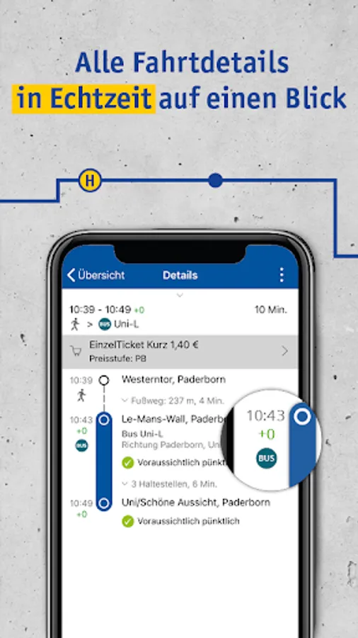 You can save around 20 percent on a single ticket quickly, flexibly and through electronic purchase. In the Paderborn urban area (price level PB), you can use the timetable app to buy the following tickets digitally: short-distance, short-distance children, single tickets, children's tickets, 24-hour ticket PB and family day tickets. The tickets can be bought either directly or from the timetable information.