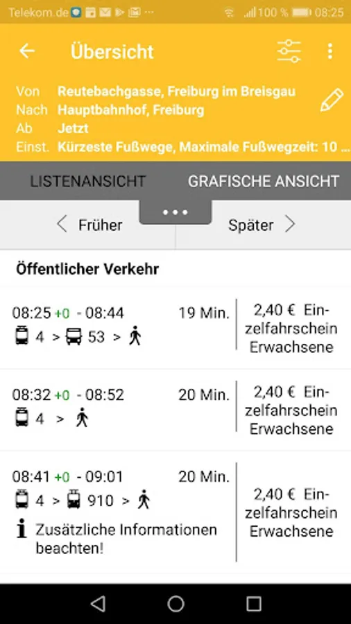 Individual adjustment options, e.g. Running speed and preferred means of transport. The connection overview can be displayed both as a list and as a graphic. This will always give you connection recommendations tailored to your needs.