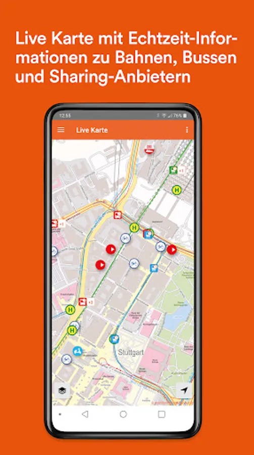 - Interactive live map with current vehicle positions and routes as well as currently available bike and car sharing offers