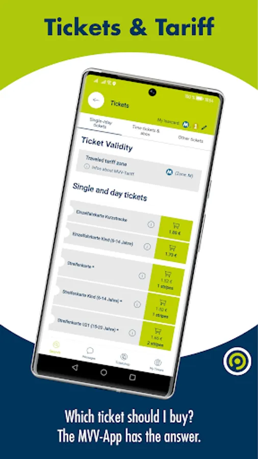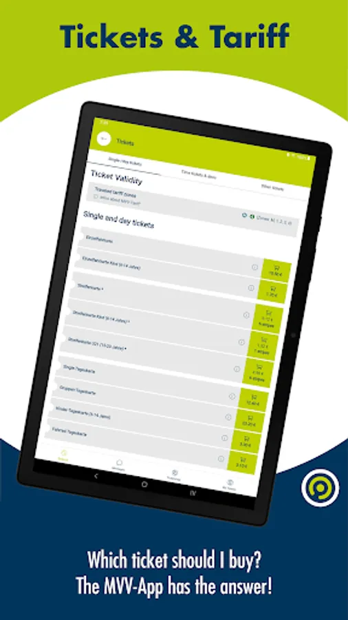 • Tickets: With menu item “Tickets” you can purchase selected MVV tickets as mobile ticket. Register once within one of the listed shops (identical range of tickets) and choose your ticket before starting your journey. You can pay for your tickets by using Google Pay, a credit card or direct debit. As electronic tickets are personalized, you have to bring your official photo ID.