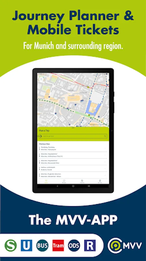 It provides travel information for the entire public transport network in Munich and the surrounding regions (districts of Dachau, Ebersberg, Erding, Freising, Fürstenfeldbruck, München, Starnberg and the norhern part of Bad Tölz-Wolfratshausen) – no matter whether you go by train, (sub)urban railways, underground, tram or bus. In many cases with real-time information. With the MVV-App you can also purchase selected MVV tickets with your smartphone or tablet on the go. Register once and you have the option to either buy the single trip tickets or you can choose to buy one of our day tickets for your stay in Munich. Besides, the MVV-App provides additional information on public transport in the entire Greater Munich Area, such as public transport and tariff maps as well as any changes in the timetables.