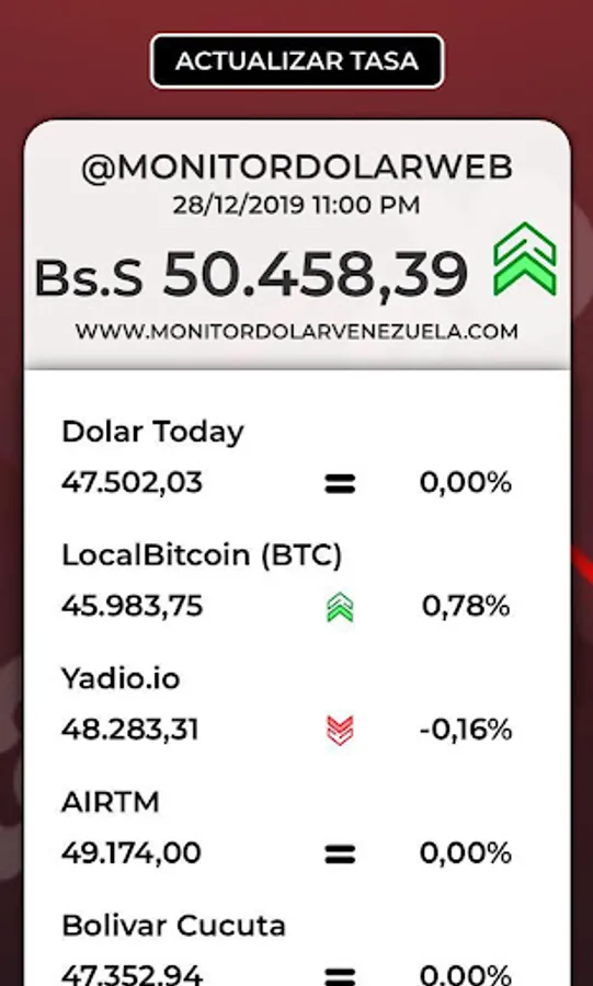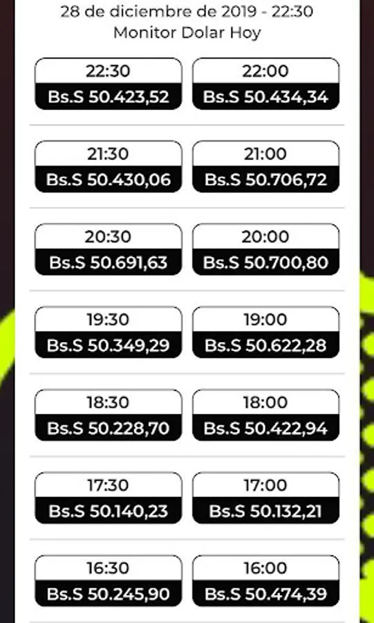 Our application shows the average price of the official and parallel dollar with update every 30 minutes.