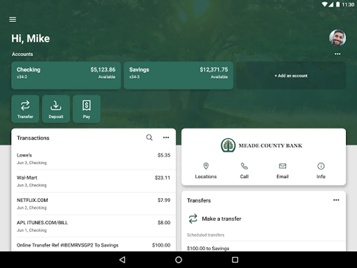Contact: Locate ATMs or branches and contact Meade County Bank customer service directly from the app.
