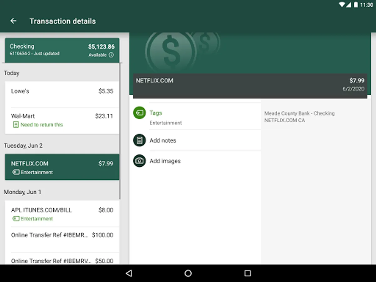 Add Tags, Notes, Images & Geo-Information: By enhancing transactions with custom tags, notes or photos of a receipt or check, you have the ability to stay organized and find exactly what you’re looking for when searching through your finances.