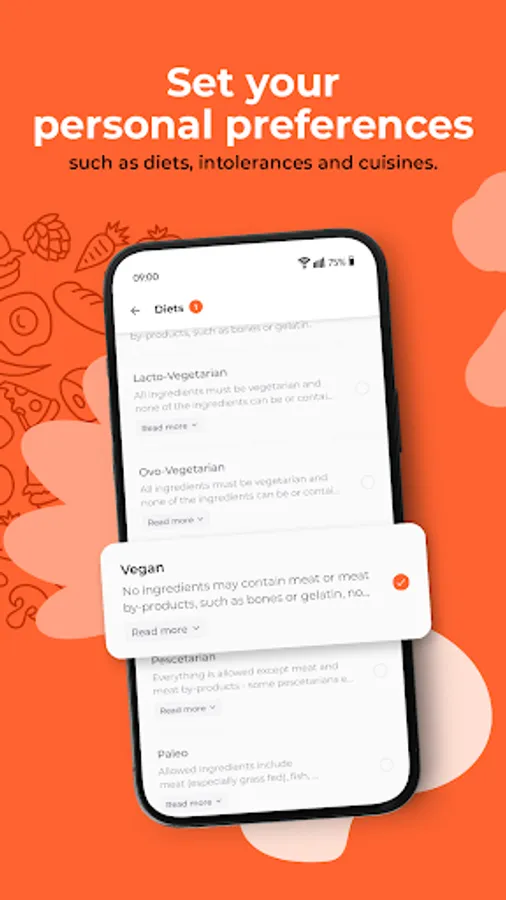 Set your personal preferences, such as diets, intolerances and cuisines.