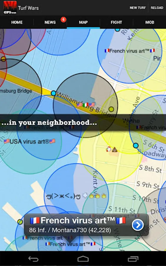 Turf Wars is the massively multiplayer online game where you claim and defend your favorite real-world places from other mobsters. Stake your claim on your neighborhood, your favorite bar or restaurant, your school or workplace – the city is yours for the taking!