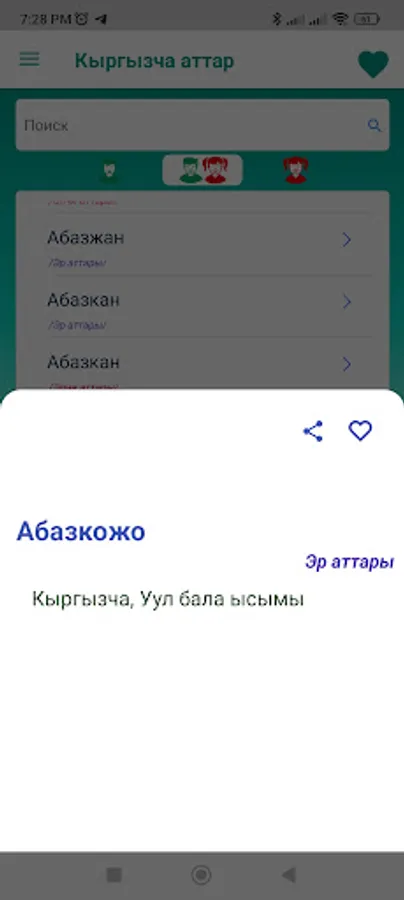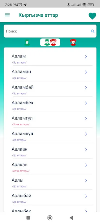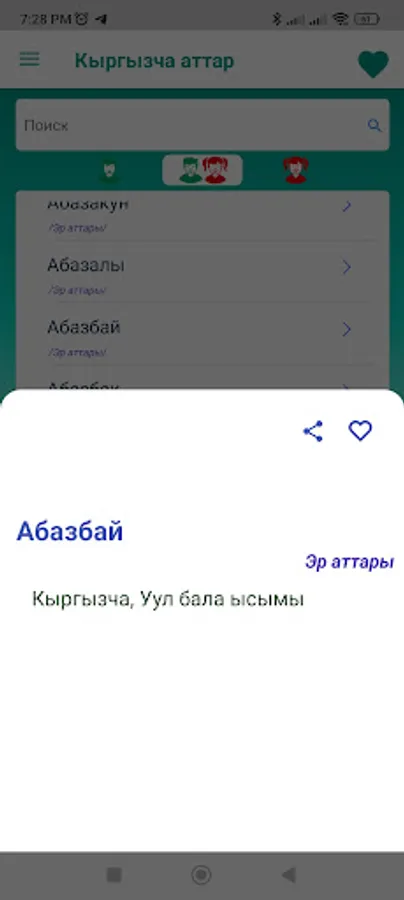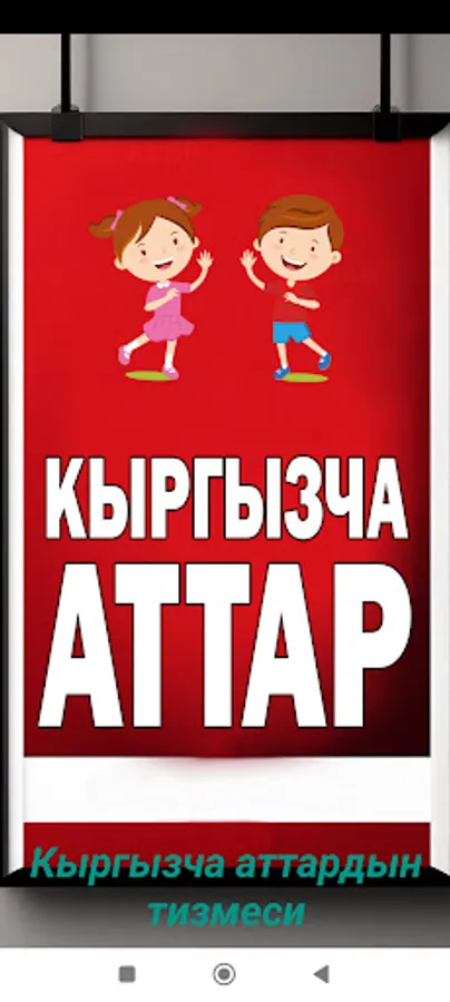 Kyrgyz Names & Meanings" - бул Android колдонмосу, ал колдонуучуларга кыргыз ысымдарынын маанисин жана келип чыгышын түшүнүүгө жардам берет. Колдонмодо ысымдардын кеңири маалымат базасы, анын ичинде алардын мааниси жана келип чыгышы, ошондой эле ар бир ат менен байланышкан жыныс бар. Колдонуучулар конкреттүү ысымдарды издей алышат же жаңыларын табуу үчүн маалымат базасын карап чыга алышат.