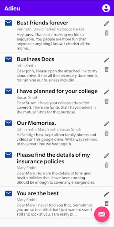 * In the Adieu app, you create messages with text and attachment for your loved ones. These messages are securely stored on our system.