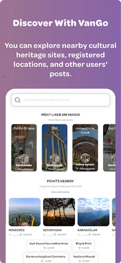 • Discovery Network: VanGo also lets you explore new destinations and see other popular posts with its "Discover" section. Moreover, you can get detailed information about the new destinations you discover and make decisions based on their distances with the help of the map feature. Explore the travel world more closely.