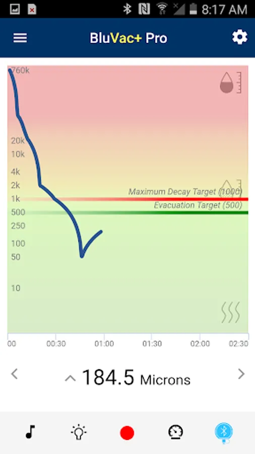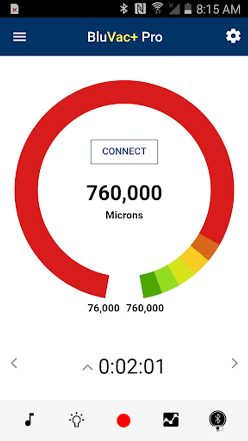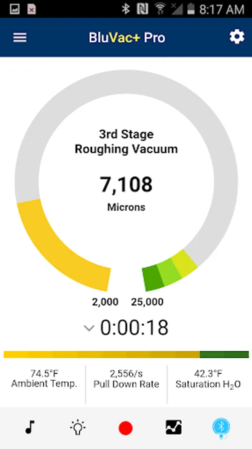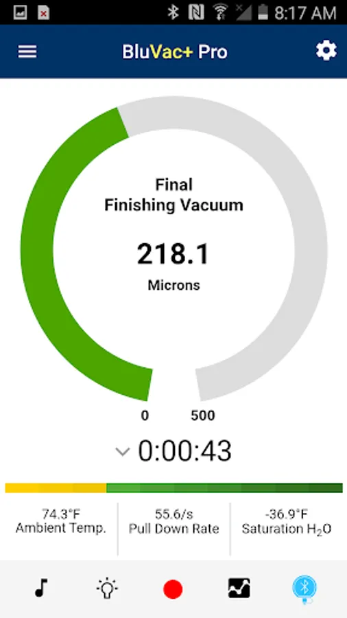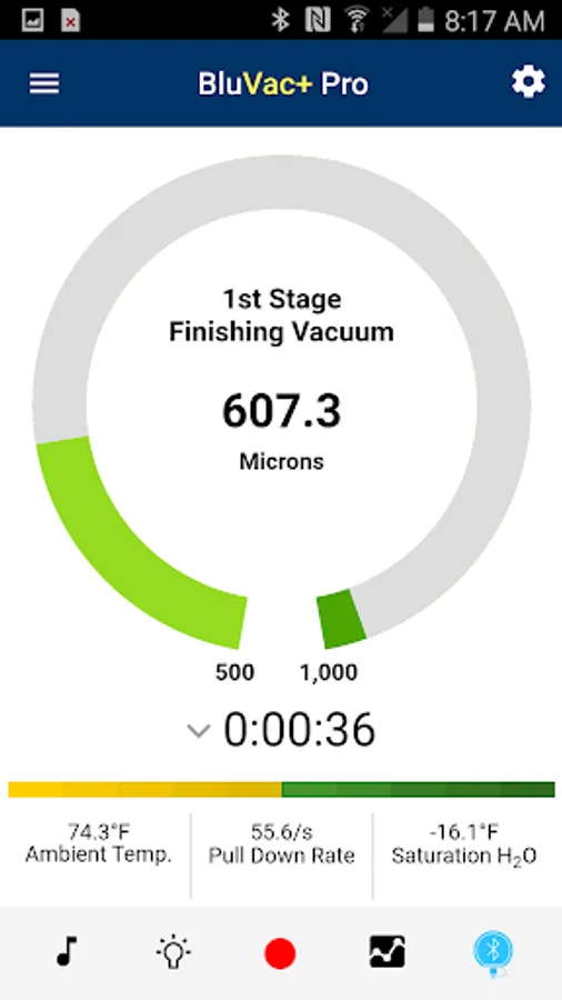 View and record results of a system evacuation process using the AccuTools BluVac+ Professional Digital Vacuum Gauge with Bluetooth Smart wireless technology. Export results in CSV or PDF format.