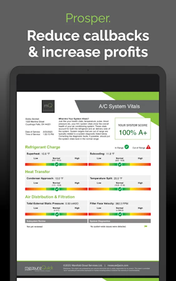 With measureQuick HVAC you can measure & diagnose system problems from the most trivial to the most complex. Our powerful data aggregation tools, coupled with just-in-time education, will increase a technicians ability to measure quick and solve problems on the job site!