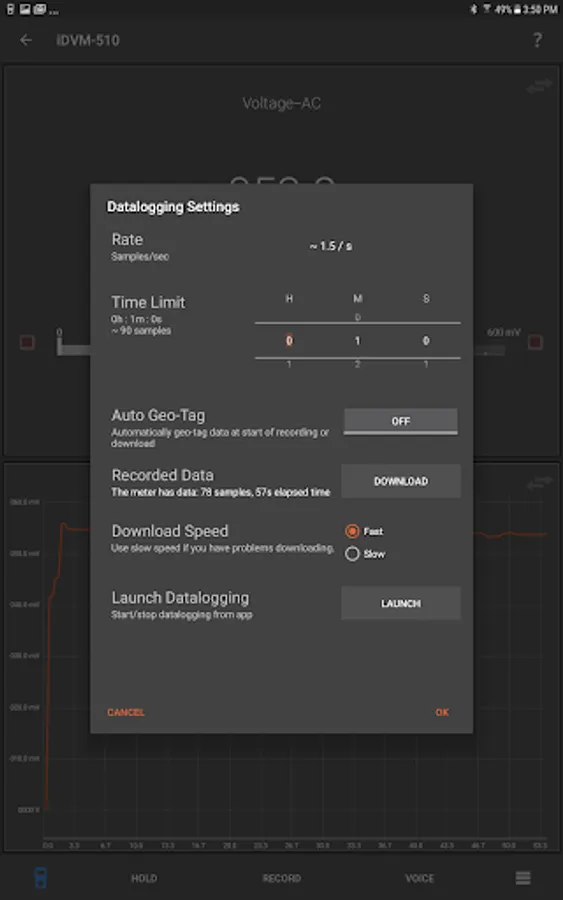 Beyond remote viewing, the iDVM allows on-meter data logging. Configure the recording session on your smart device - set the data rate and duration, press the record button on the meter and your meter can be left to record data autonomously for minutes, hours, or days. If the process being recorded is short, the data can be recorded on the smart device with a simple tap of the "record" button on the app.