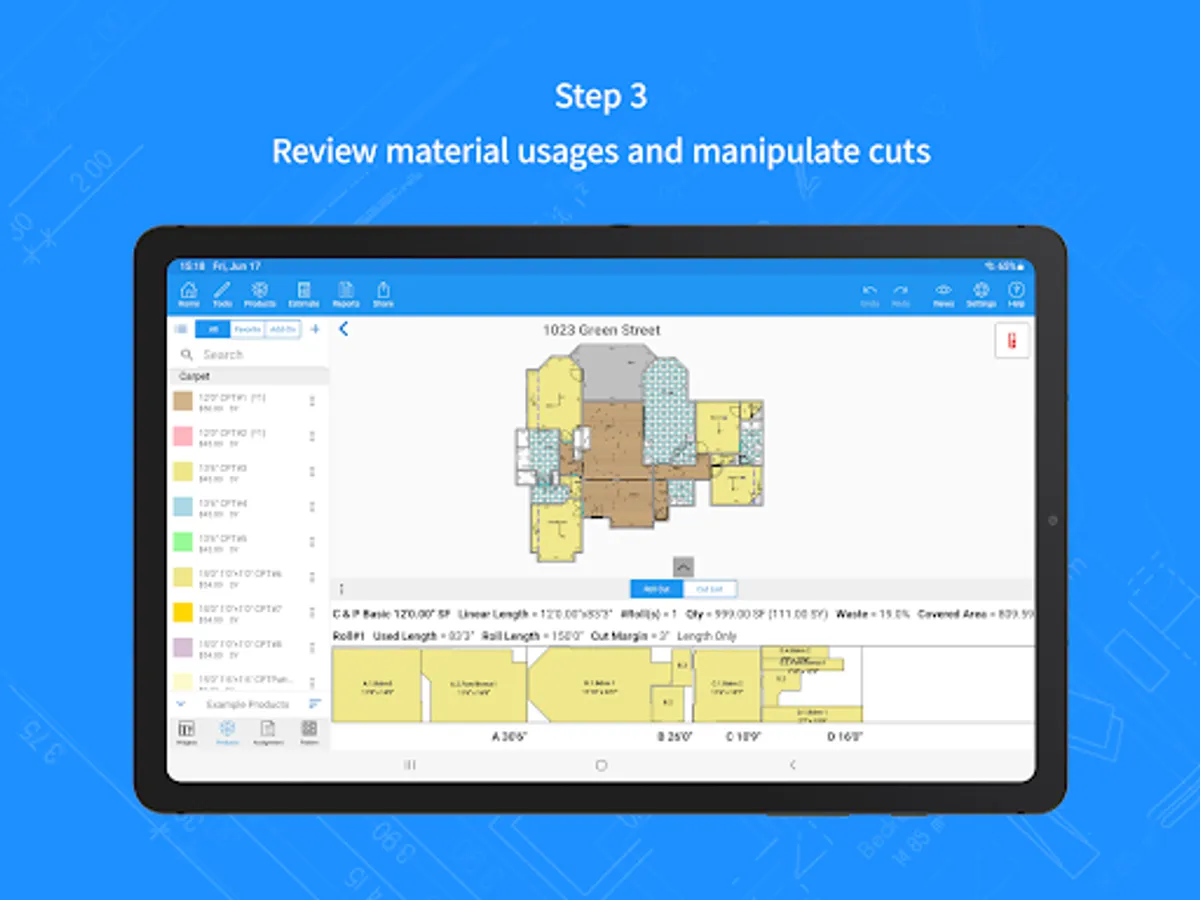 Accurately estimate carpet, vinyl, ceramic tile, hardwood & laminate, wallpaper, painting, drywall products, various area products such as underlayment, plywood and pad, linear products such as base, seam tape, molding & trims, and EA count products. And yes, this enables the user to create a quote onsite with a customer, and close the sale at the spot. Then the app creates a purchase order, work order and invoice -- without double entry.