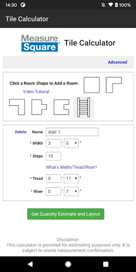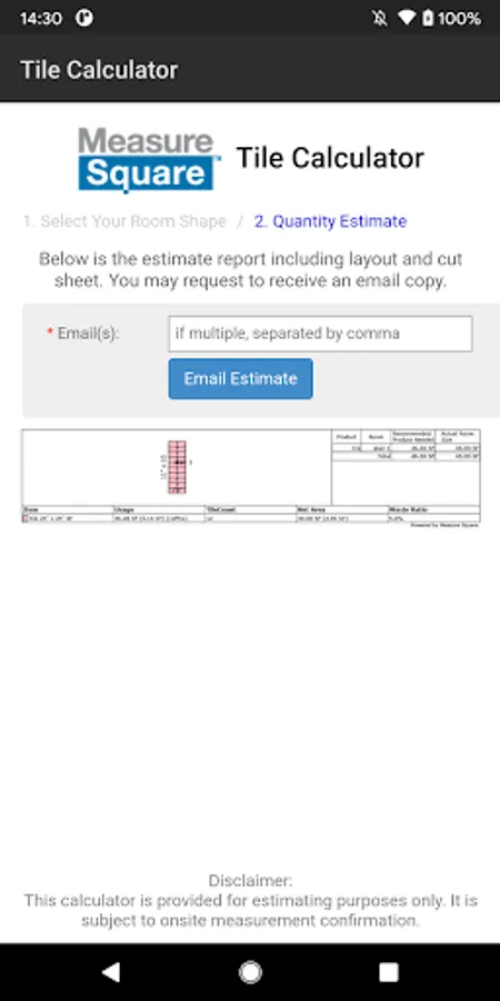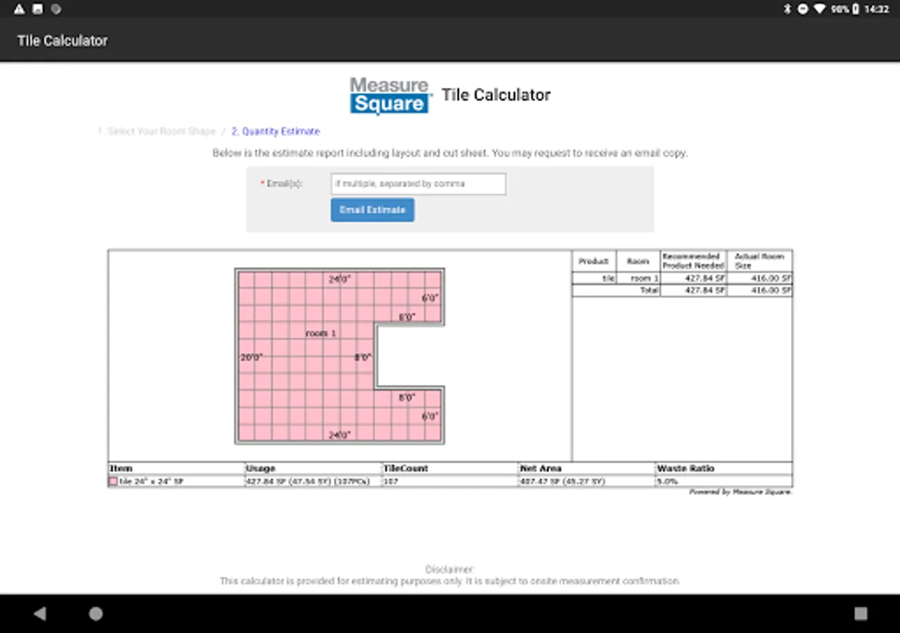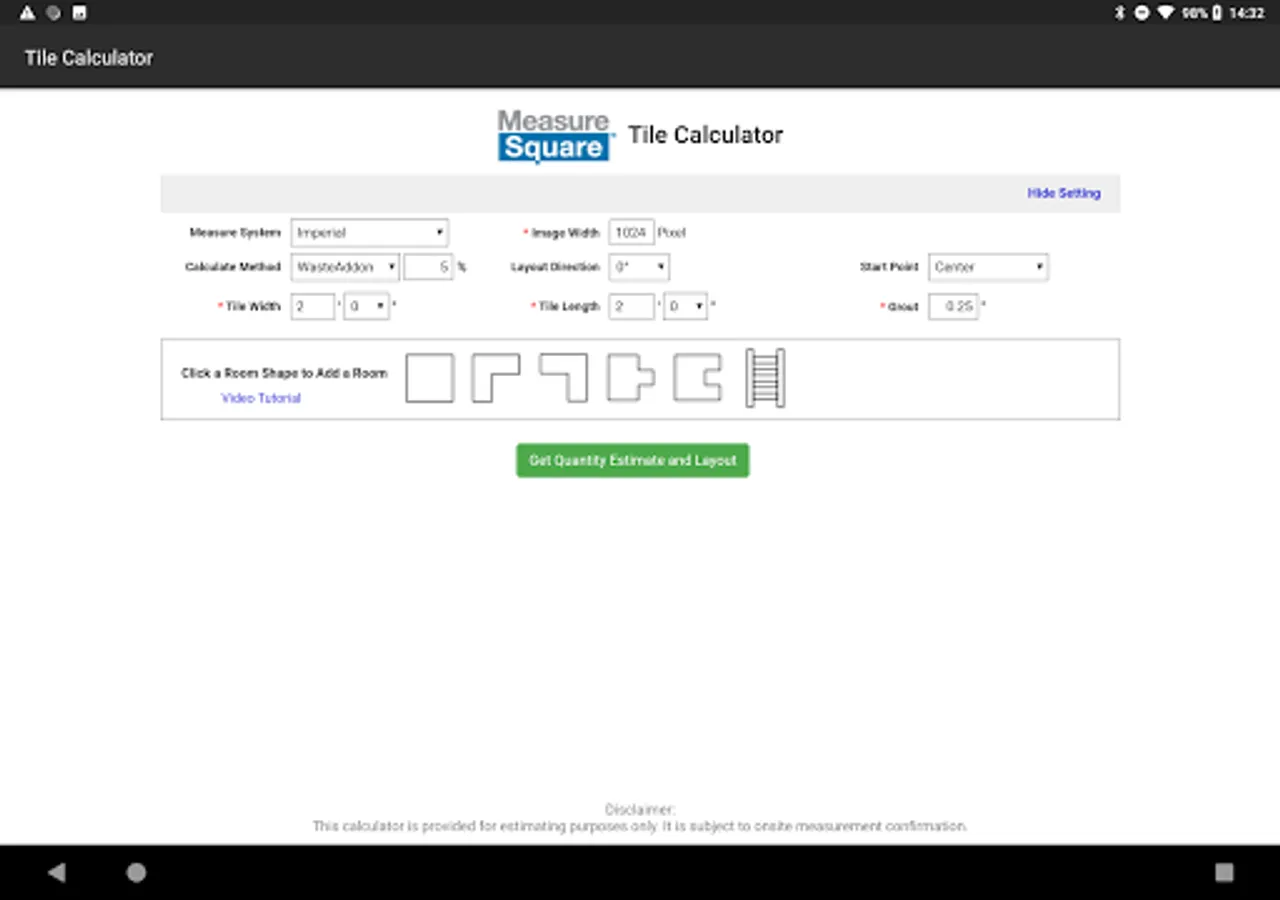 Measure Square Tile Calculator, a professional tile layout diagram and qty estimate. It estimates based on tile sizes, grout gap, and starting point of layout, and generates an estimate report with number of pieces needed, waste ratio, net floor area and etc., and an exact layout diagram.
