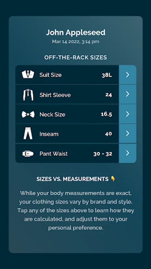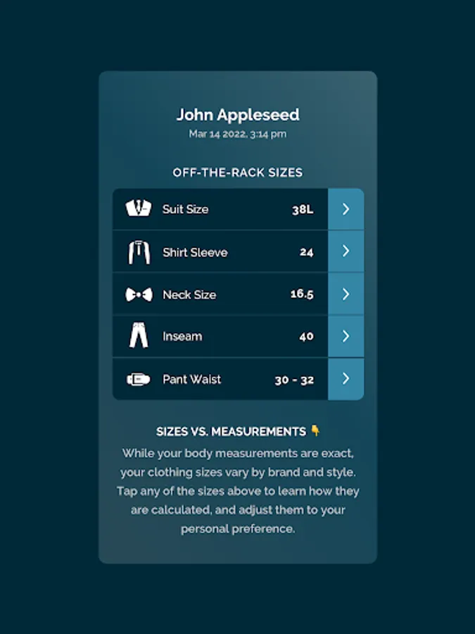 We offer free body measurements! Let our app measure you 20% more accurately than a professional tailor in just 30 seconds using your mobile device.