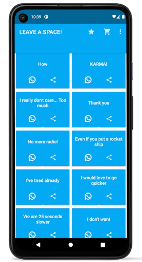 LEAVE A SPACE app sole purpose is to entertain its users. In LEAVE A SPACE app, you can find sounds and phrases that will make you laugh, both alone and with you friends. Therefore, the app stimulates you to be a better version of yourself, making you funnier while talking to your friends.