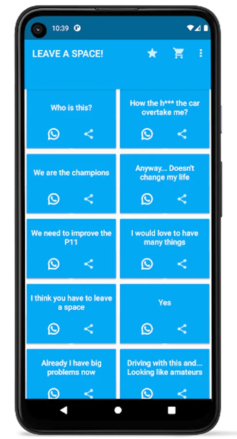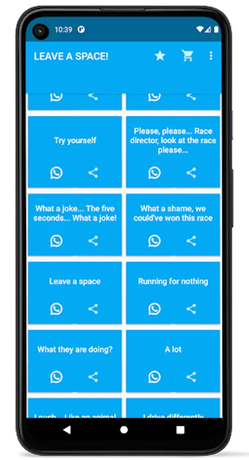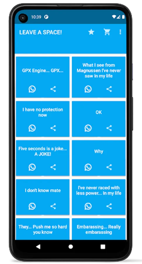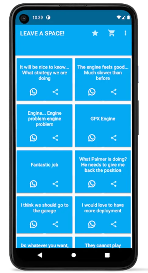 This app is a soundboard that allows you not just to listen, but also share with your friends the most classical phrases, sounds and mumbles from formula racing.