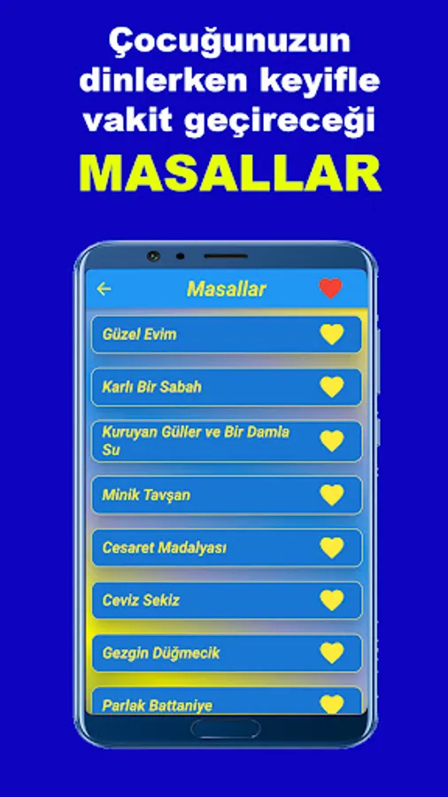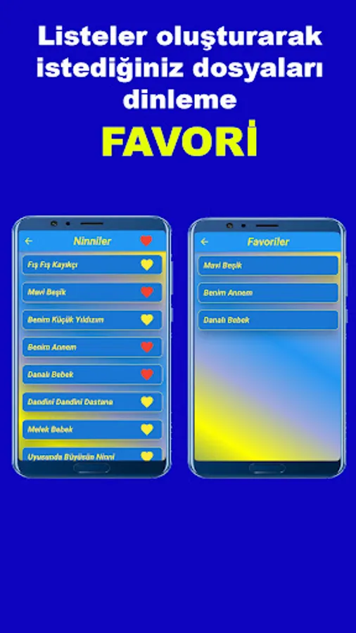 Favorite lists can be created by pressing the heart symbols in the Song, Lullaby and Tale sections. Contents can be played either from the general lists or from the favorites list. In addition, these lists are saved in the phone memory and remain in the memory in the same way when the application is closed and opened.
